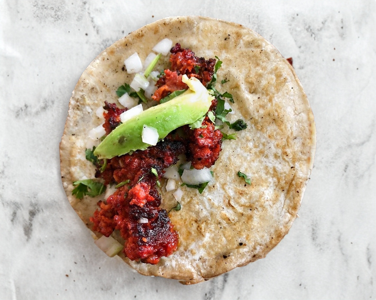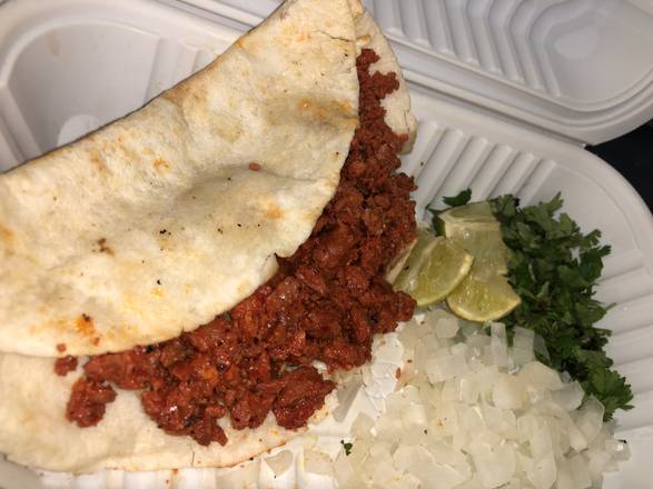 Plato Personal // (Plato de 230gr) Acompañado de frijoles, cebollas, chorizo y tortillas de maíz, salsa que no pica, salsa que pica, salsa de aguacate, cilantro, cebolla y limón.