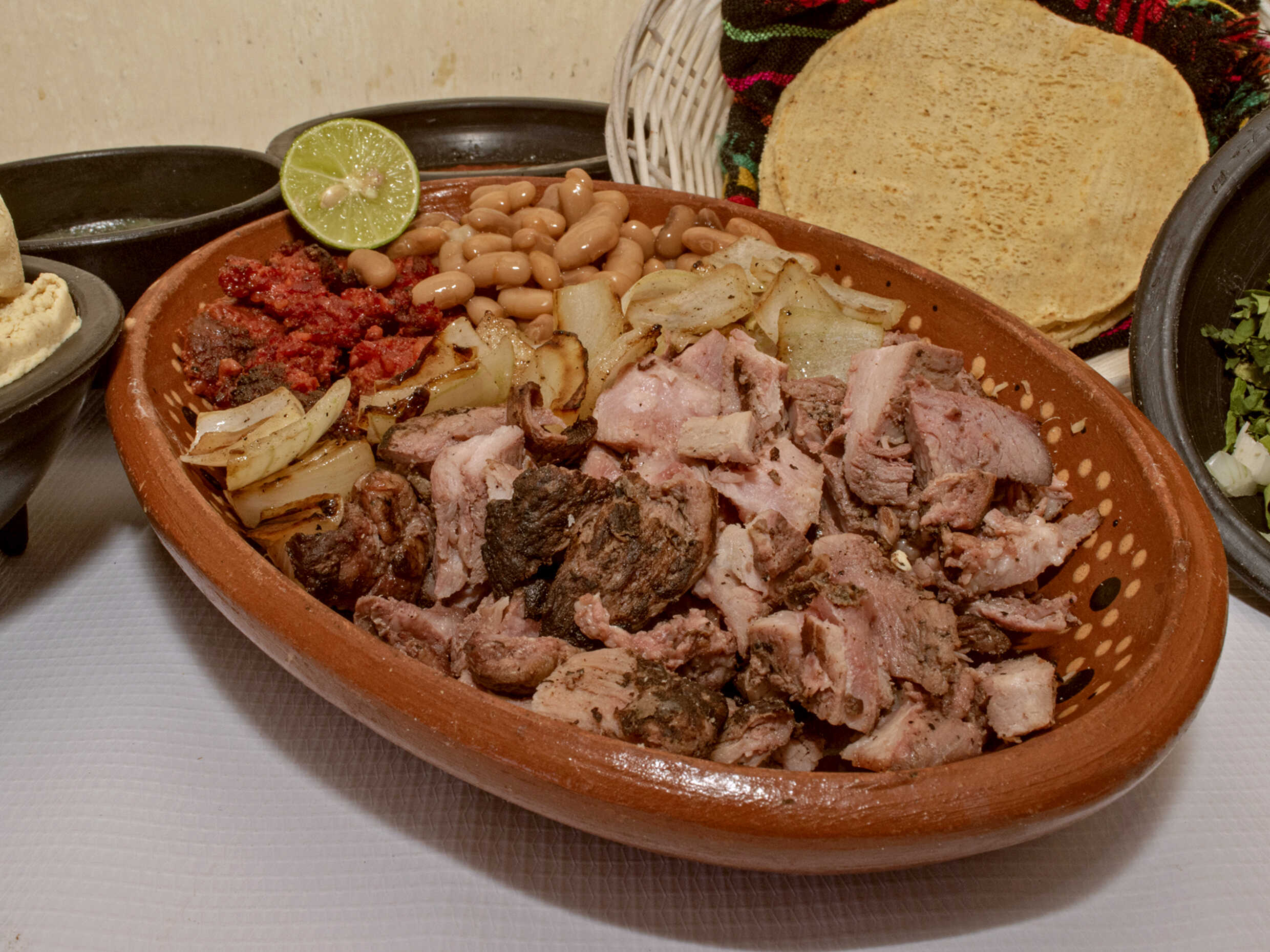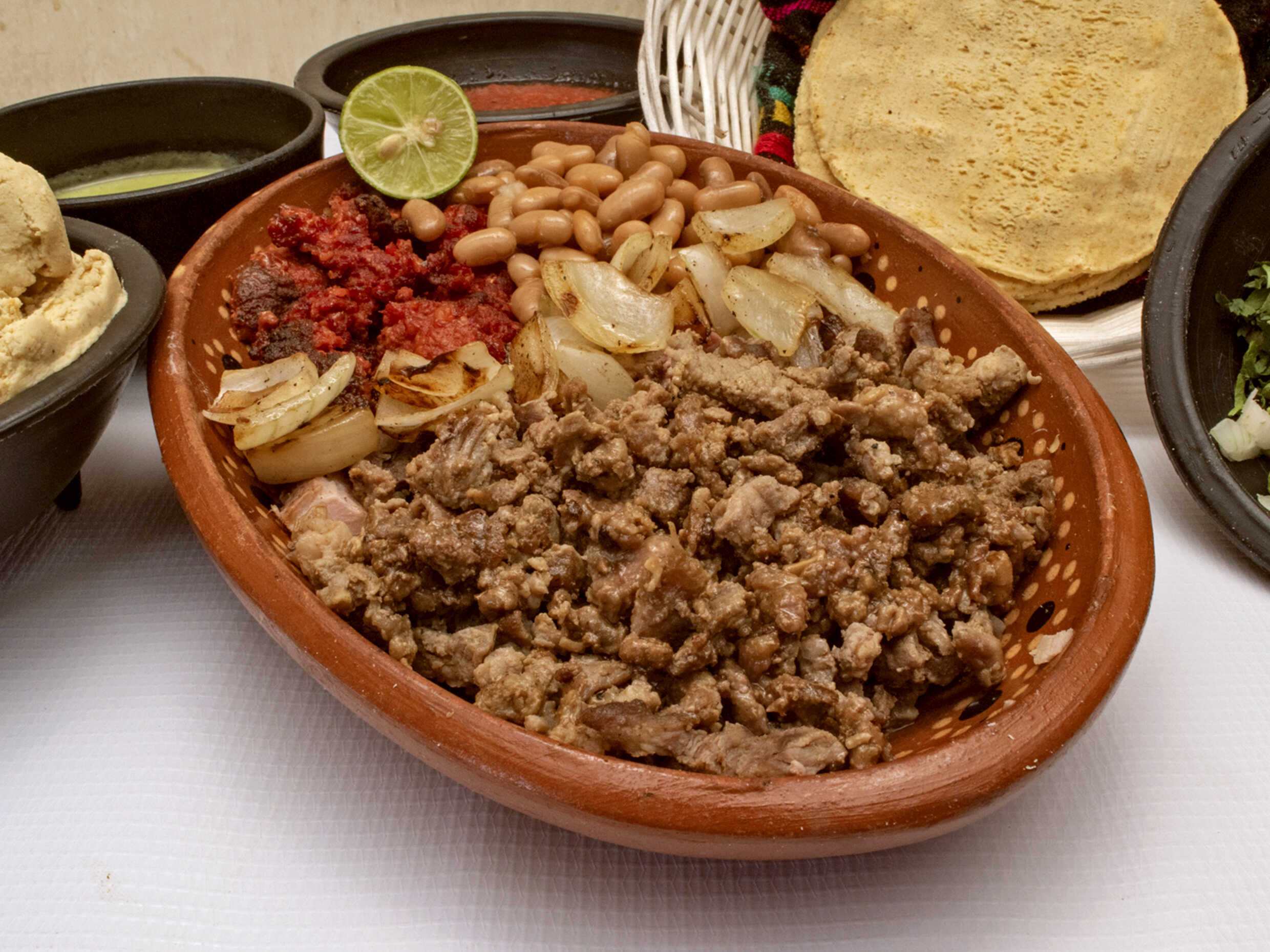 Acompañado de frijoles, guacamole, cebollas, chorizo y tortillas.