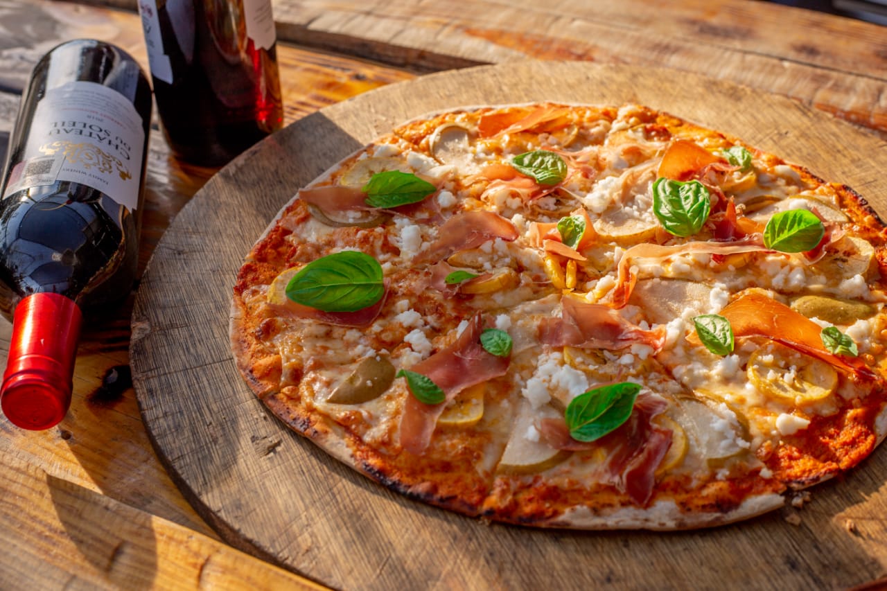 Platano macho, pera, jamon serrano, queso crema albahaca