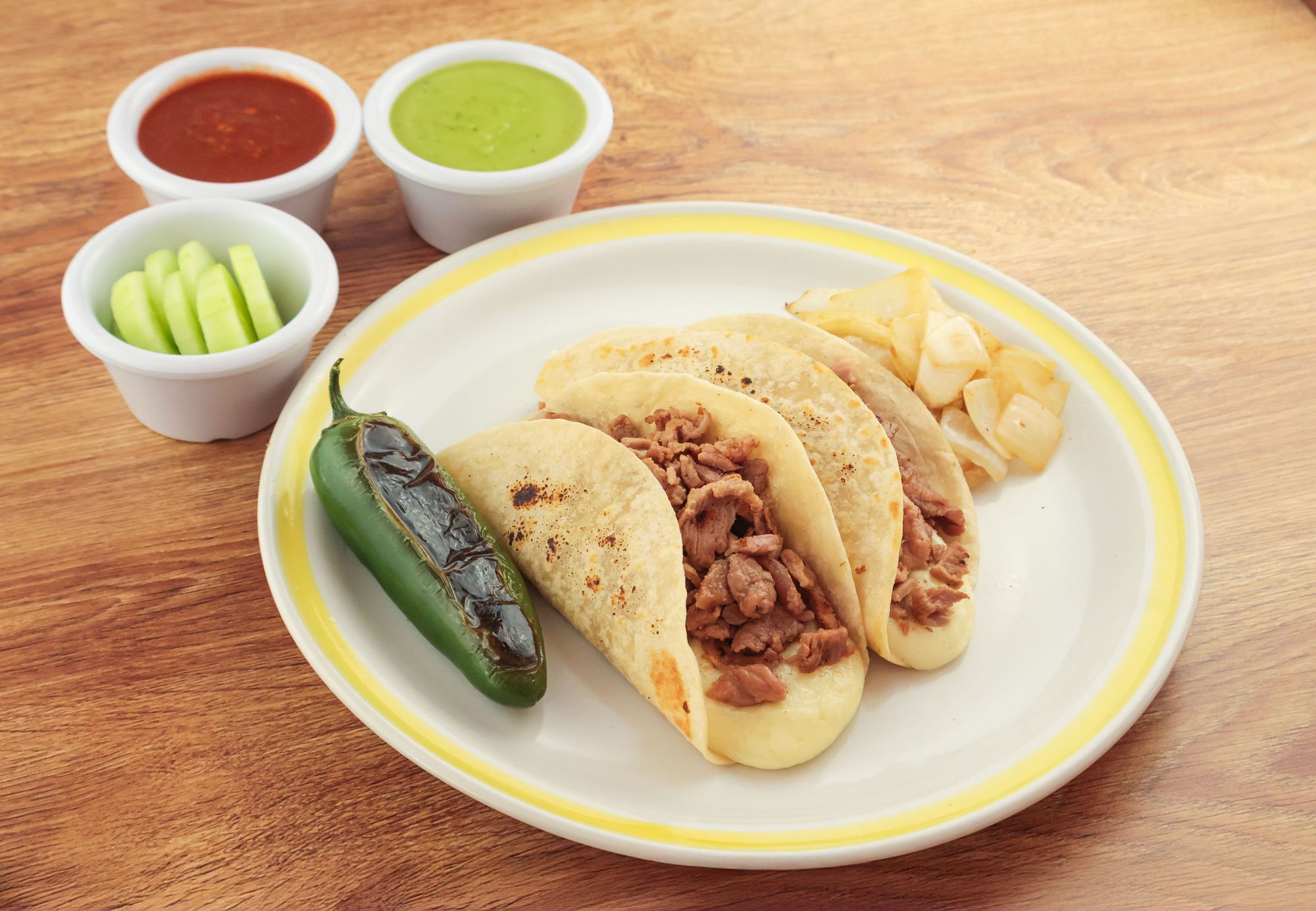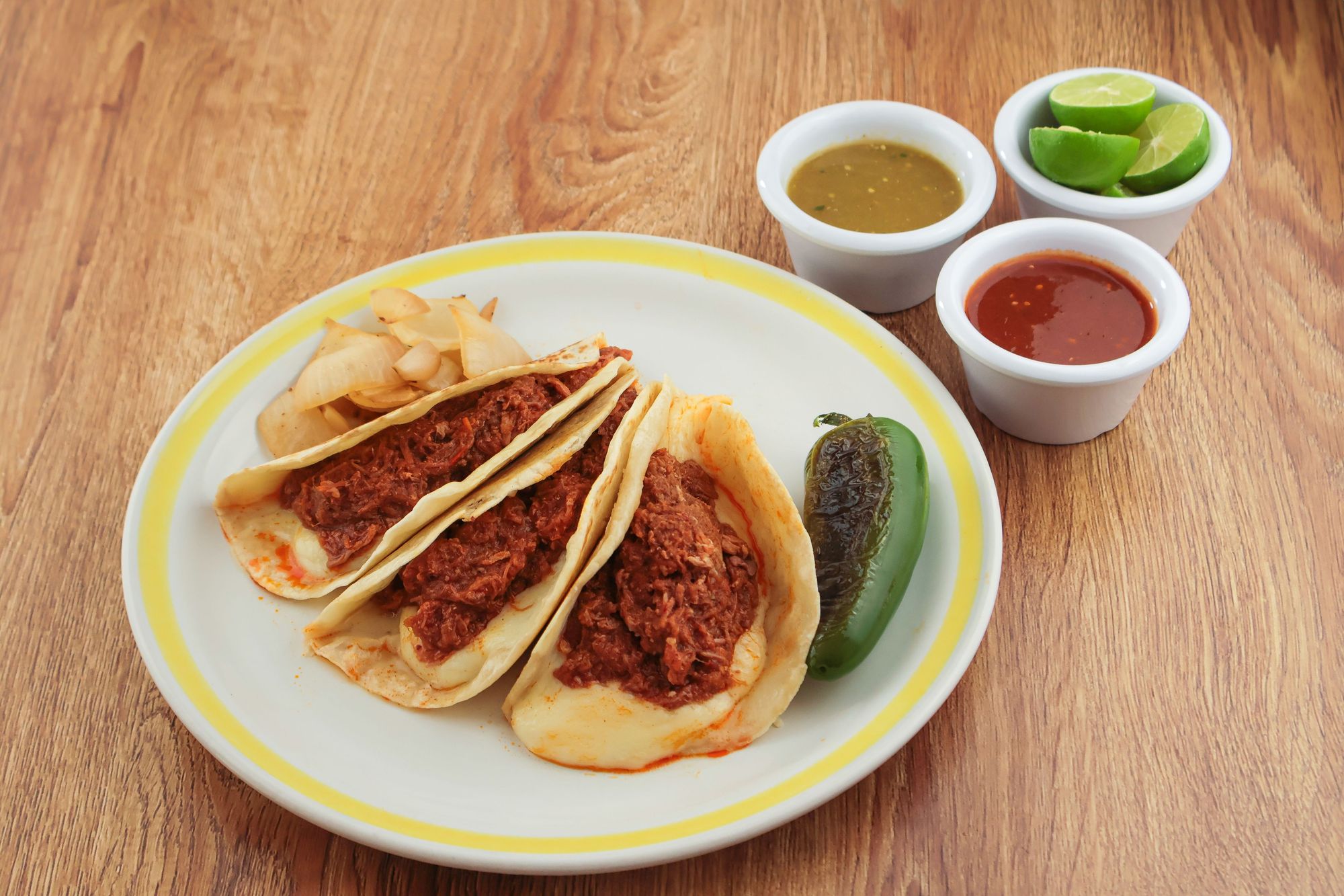 Barbacoa de res, tortilla de maíz, queso gratinado.