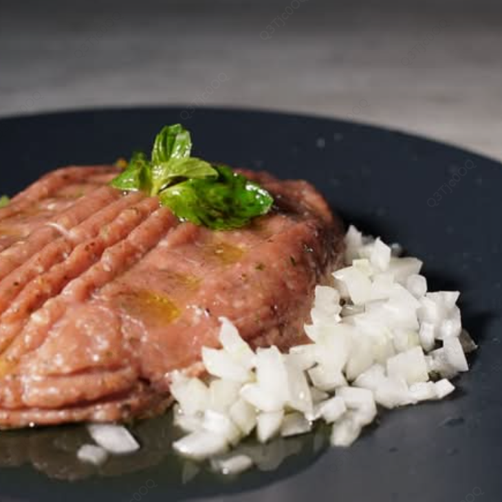 Nuestra versión de carne de res tártara con trigo y aceite de olivas.