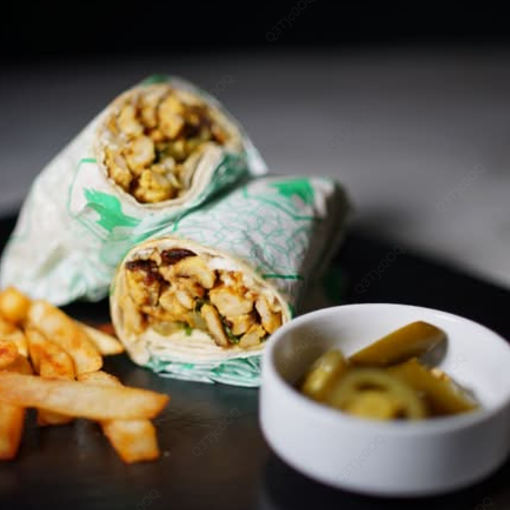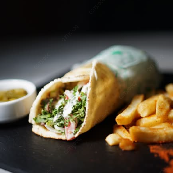 Pan pita con pollo tipo pastor, servido con papas fritas y alioli.
