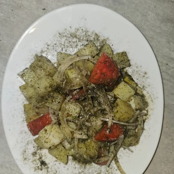 Ensalada de papa con jitomate, cebolla, aceite de olivo y un toque de hierbabuena.