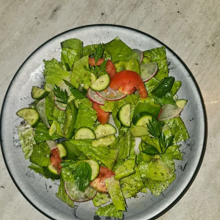 Ensalada tradicional libanesa con lechuga, jitomate, perejil, pepino, rábano y crujiente pan.