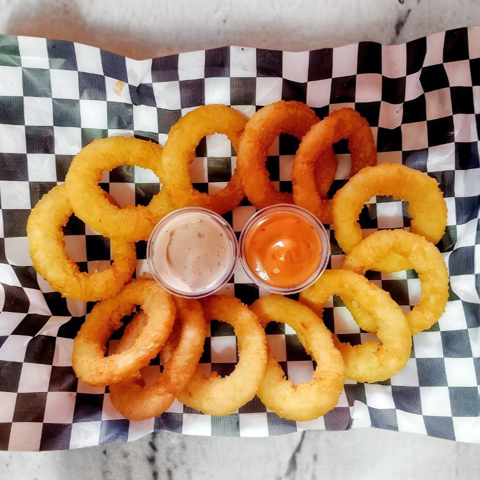 12 aros de cebolla, aderezo ranch.