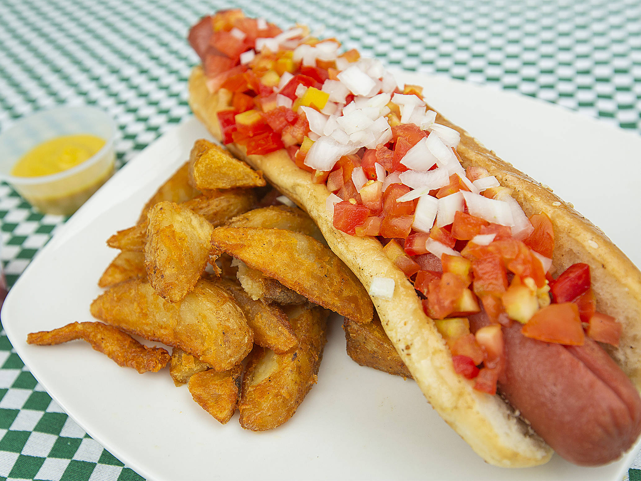 Hot dog de 24 cm salchicha rellena de queso y tocino, las verduras se envían aparte.