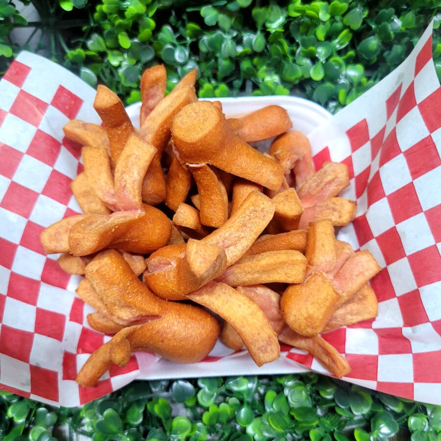Papas gajo fritas con jamón, queso Oaxaca, piña asada y aderezo ranch.