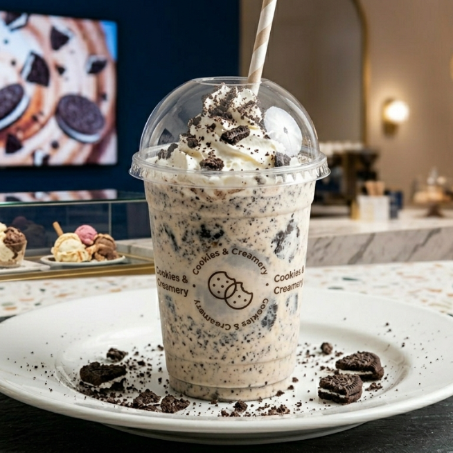 Malteada de Oreo con trozos visibles de galleta, crema batida y galletas Oreo encima