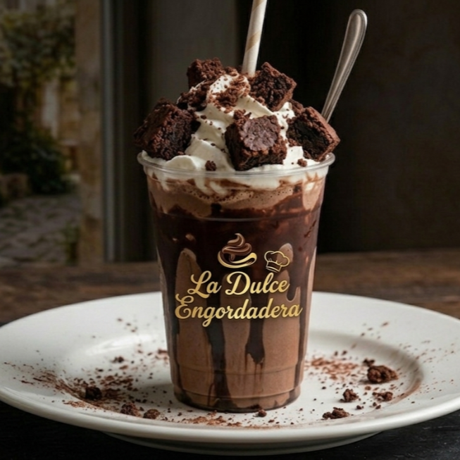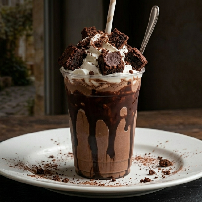 Malteada de chocolate espesa con chorreado de chocolate, crema batida encima y trozos de brownie