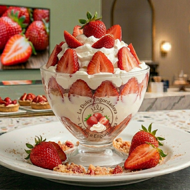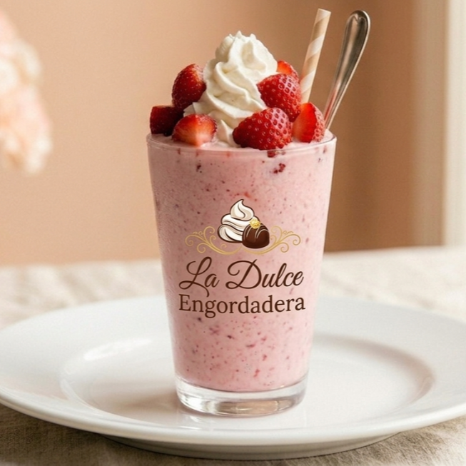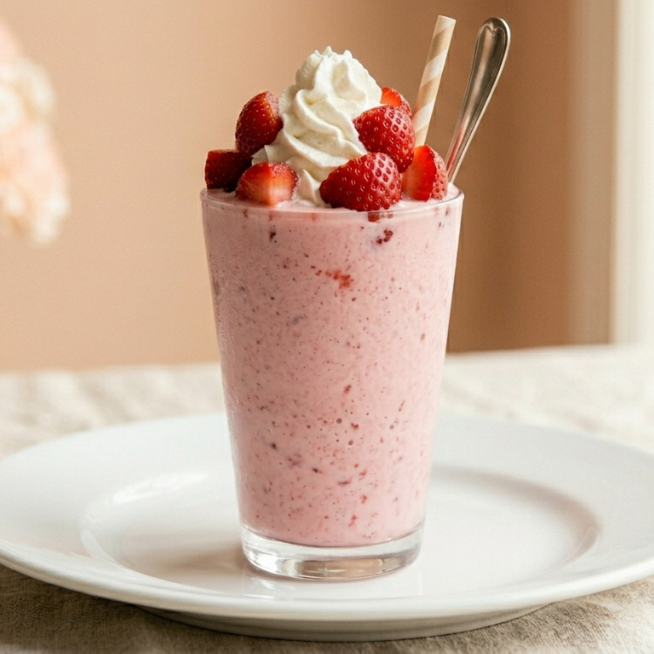 Malteada de fresa espesa, con crema batida y trozos de fresa encima y Toppings