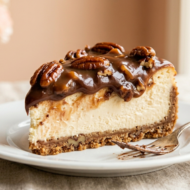 Rebanada de cheesecake cremoso con topping de chocolate y caramelo tipo tortuga, nuez encima