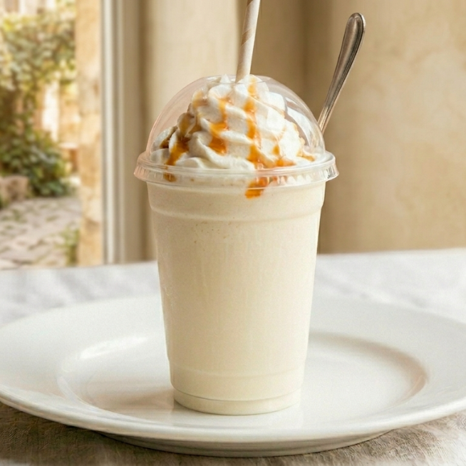 Malteada de vainilla cremosa con crema batida y drizzle de caramelo.