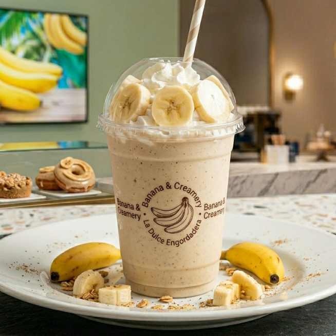 Malteada de plátano Cremosa con rodajas de plátano y crema batida encima