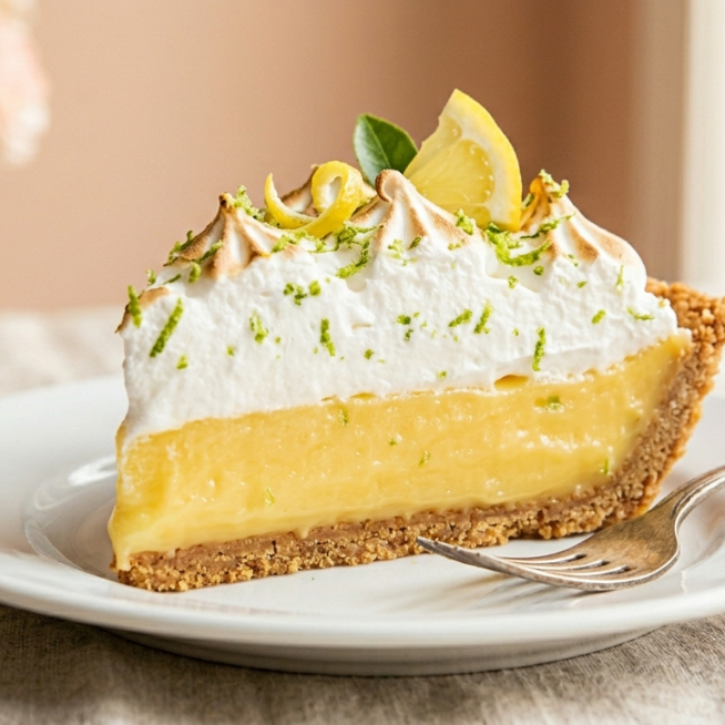 Rebanada de pay de limón con relleno cremoso amarillo suave y base de galleta, decorado con crema batida y ralladura de limón