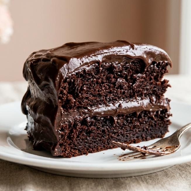 Rebanada de pastel de chocolate intenso tipo Matilda, ultra húmedo, con capas gruesas y brillantes de ganache