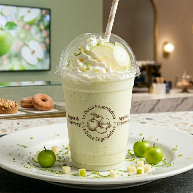 Malteada cremosa sabor manzana, decorada con rodajas finas de manzana y crema batida