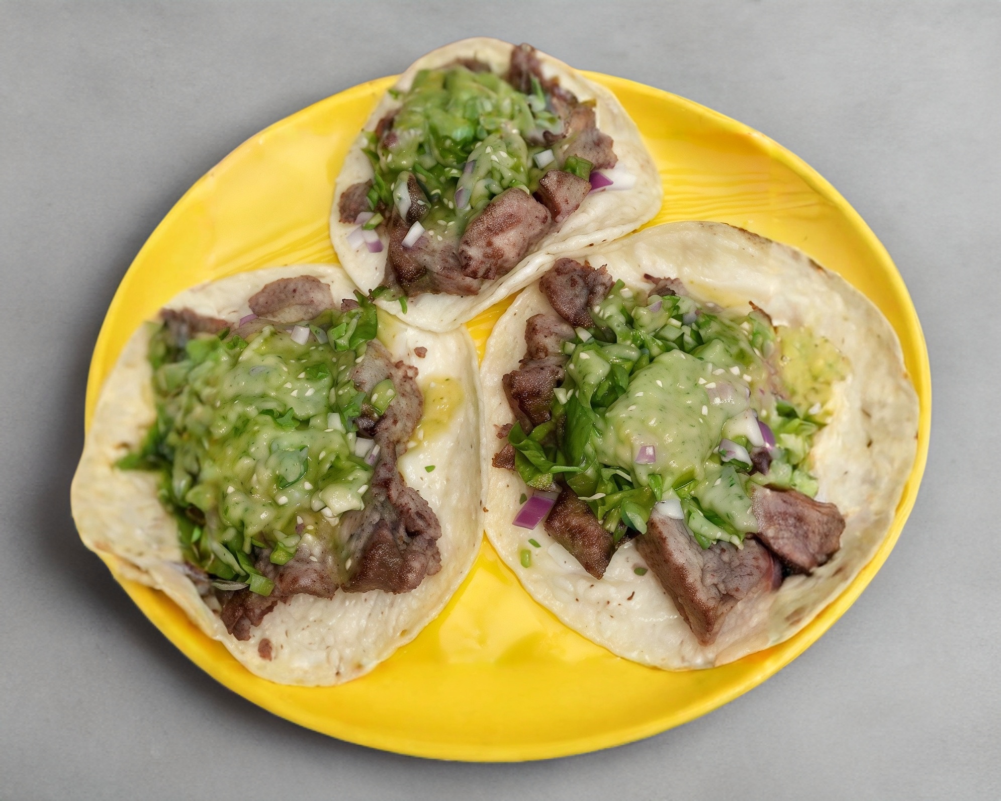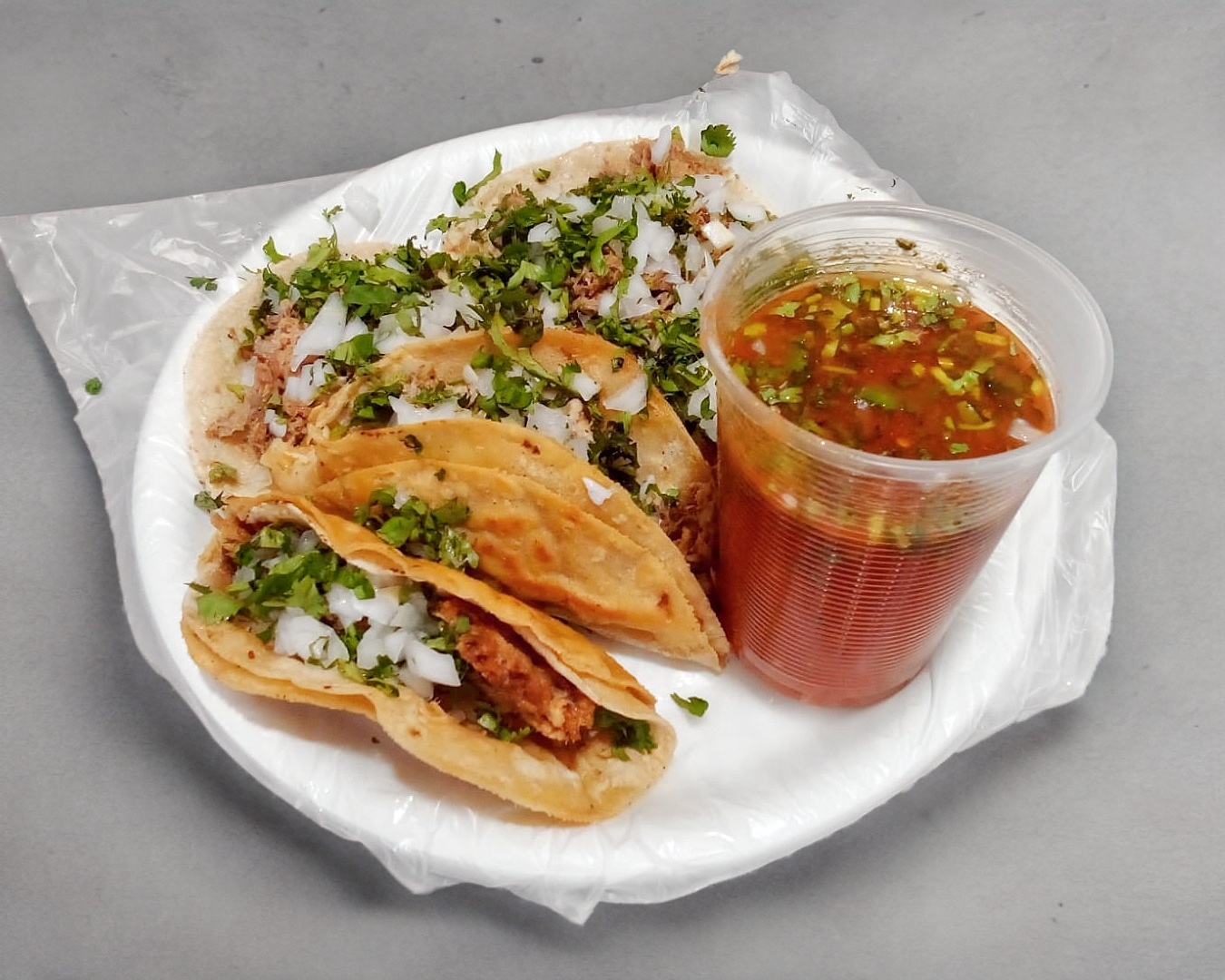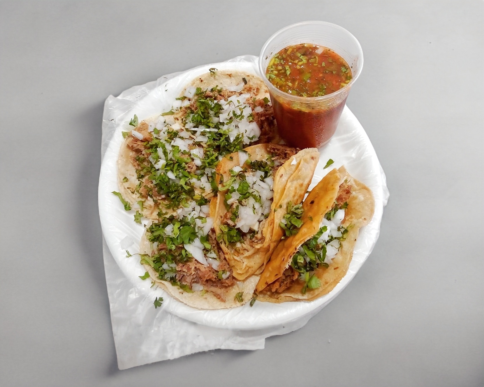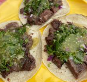 Taco con proteína a elegir en tortilla de maíz blandita con cilantro, cebolla, salsa de la casa y picante aparte.
