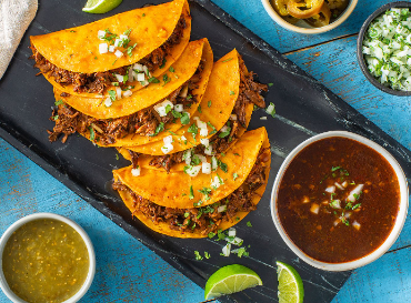 Birria 240 gr de res 250 ml de consomé acompañada con 22 tortilla de maíz, cilantro, cebolla, salsa de la casa y chile picante, porción para 4 personas.