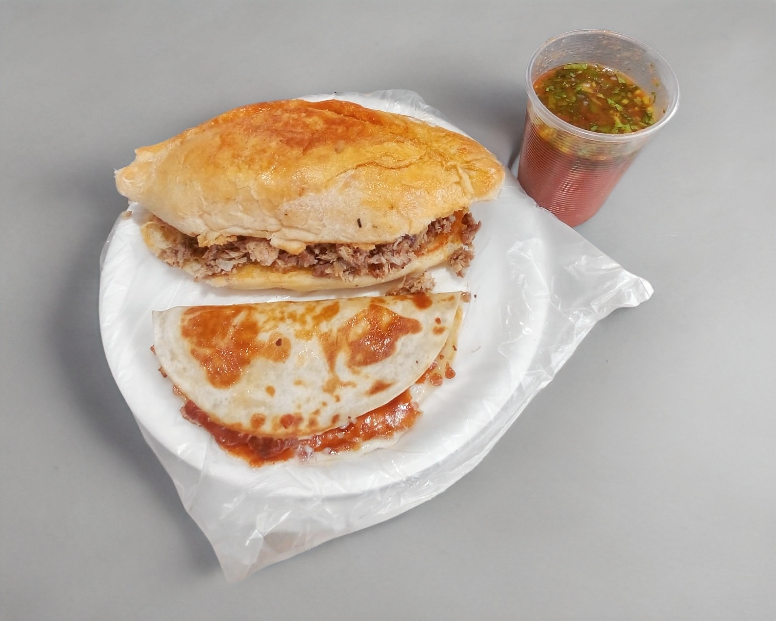 Quesadilla con carne de labio, salsa de la casa y picante.