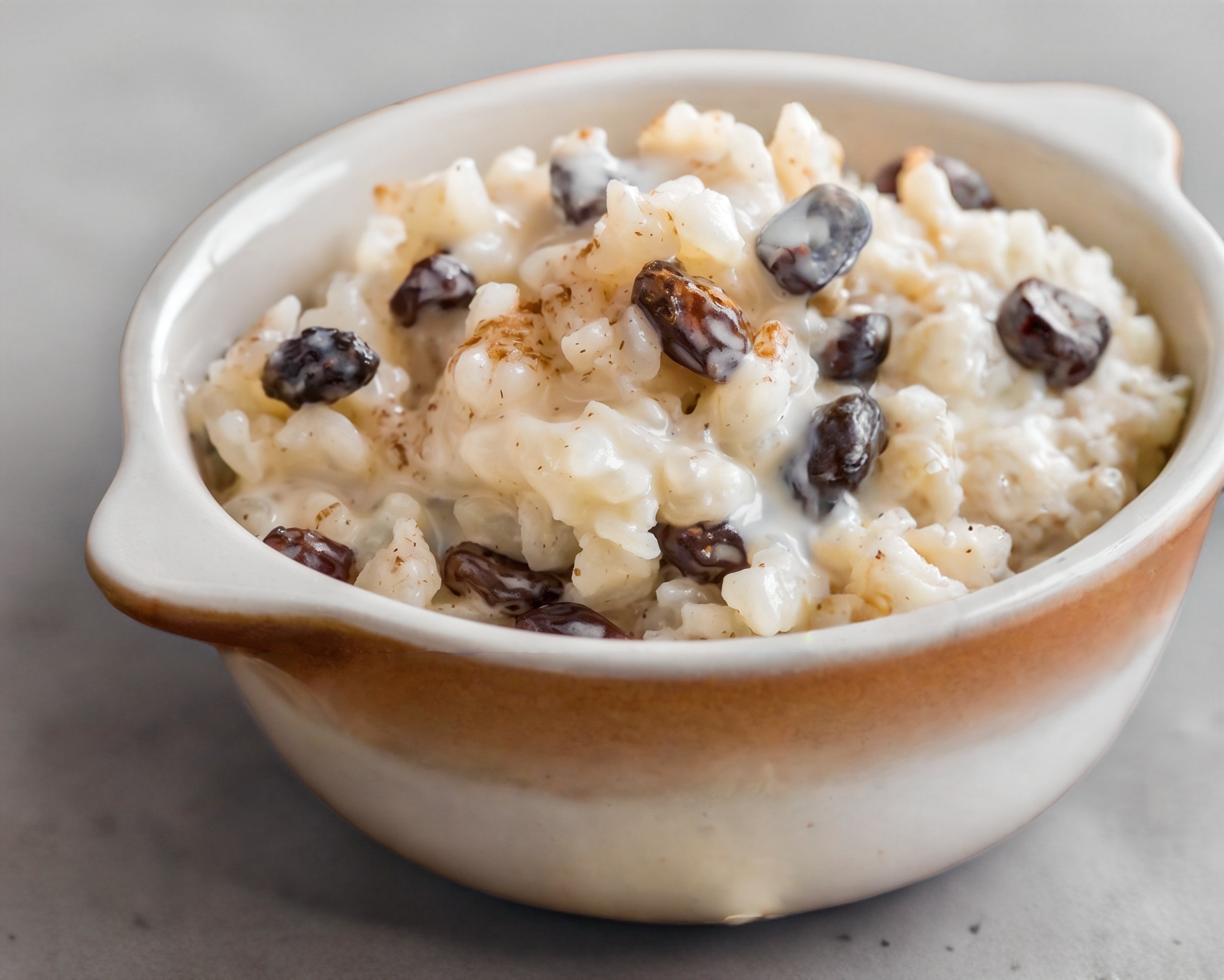 Arroz con leche, azúcar espolvoreado y canela, porción personal.