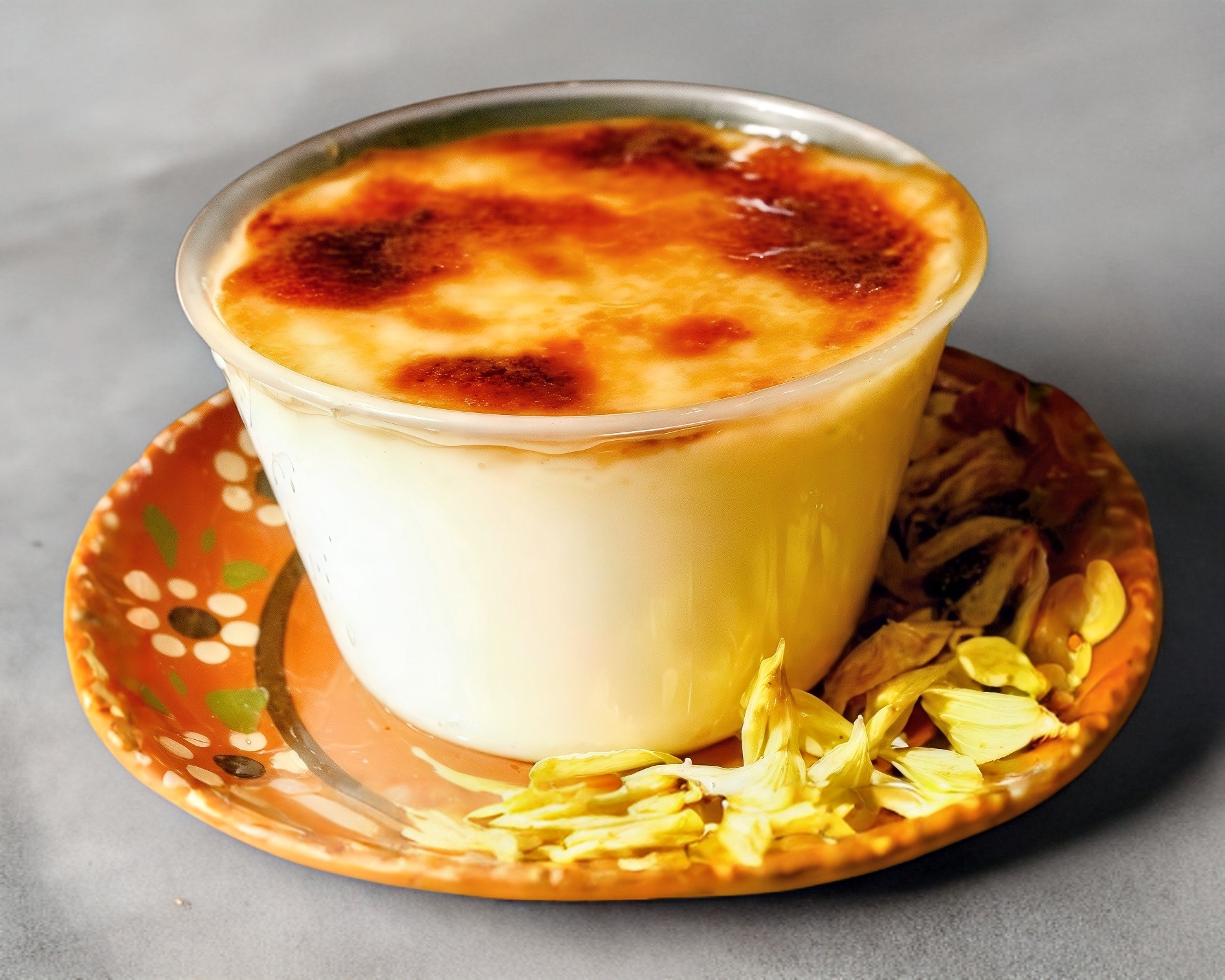Postre a base de leche, huevos, vainilla, canela y azúcar, porción personal.