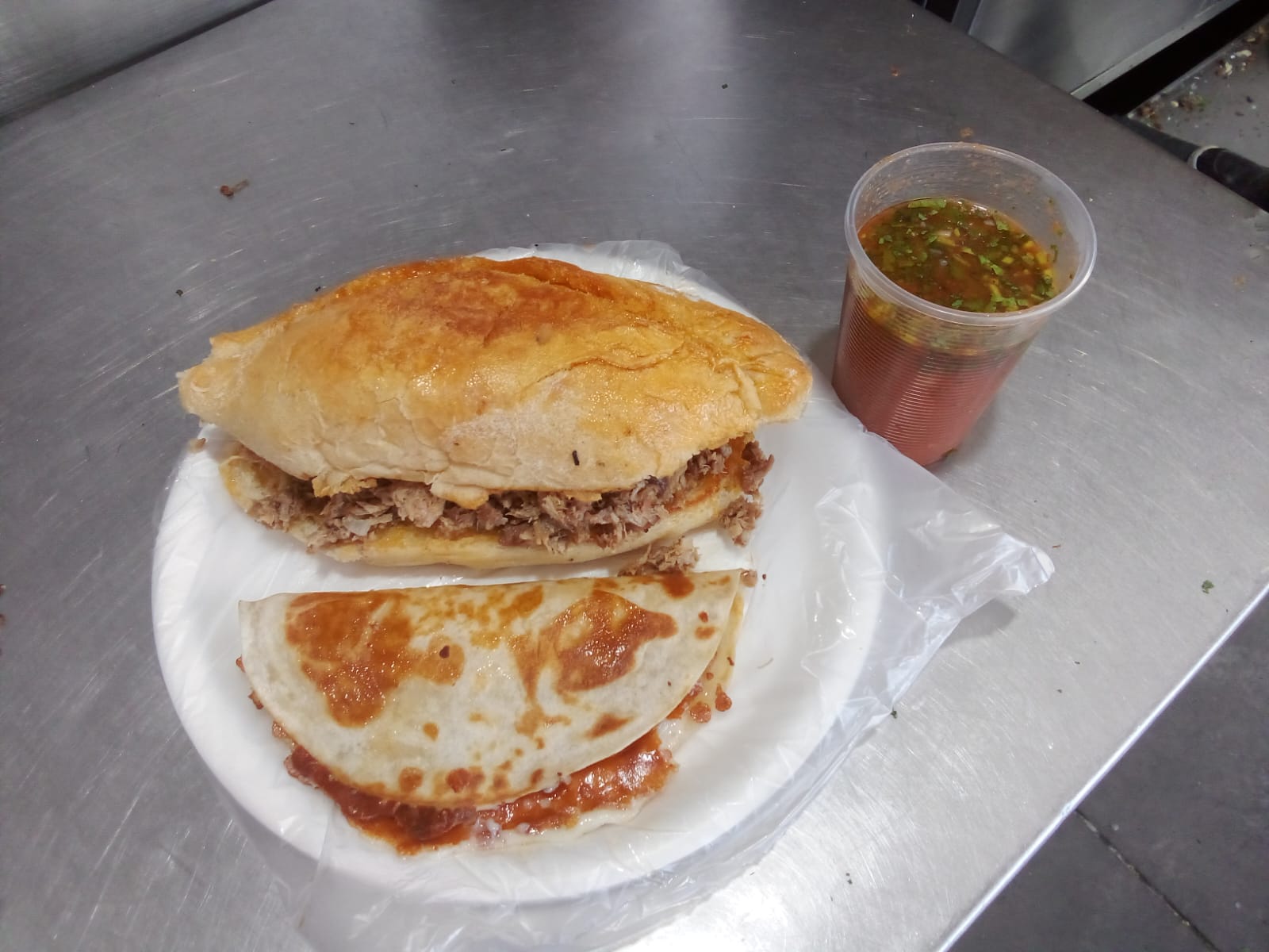 Quesadilla con birria de res, salsa de la casa y picante.