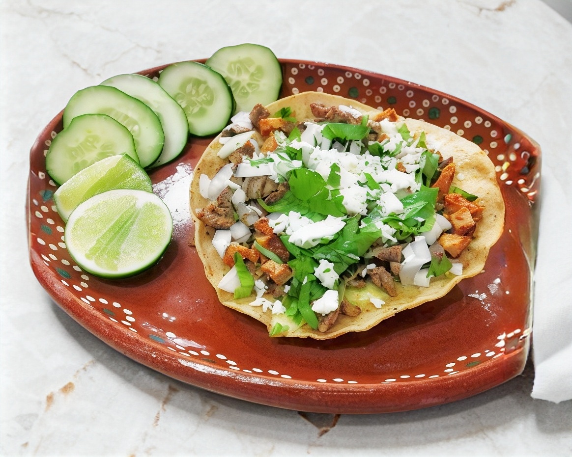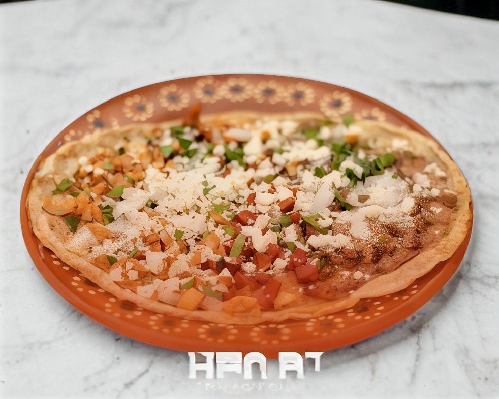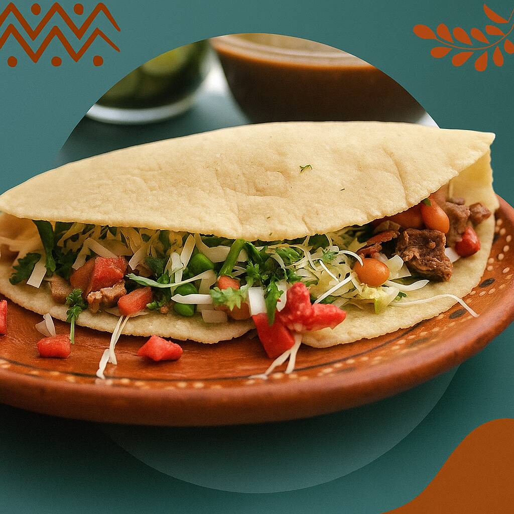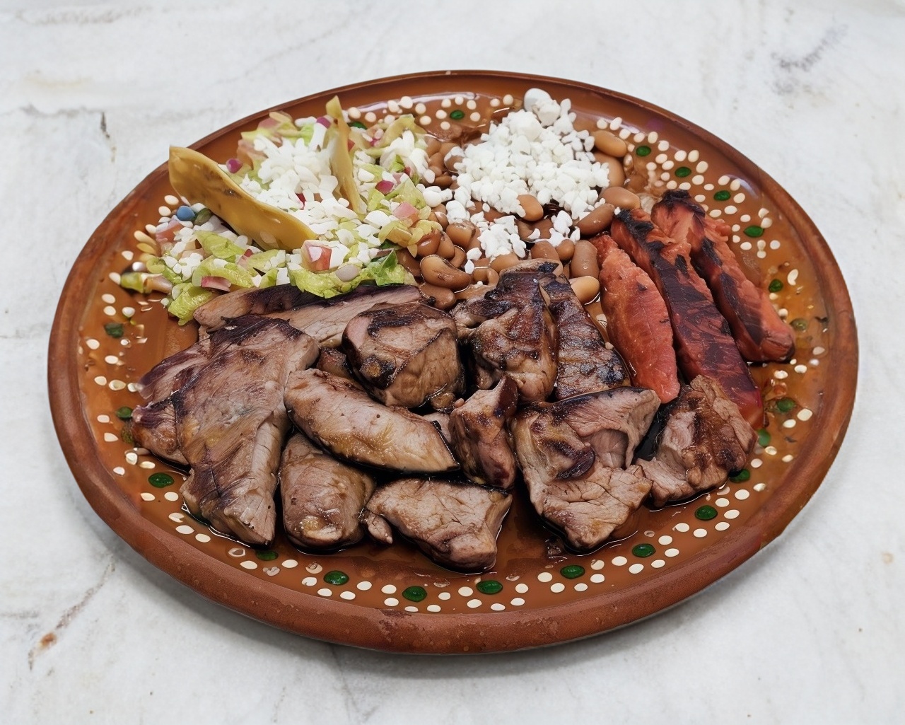 Tortilla de maíz de 30 cm de diámetro, hecha a mano con queso gratinado, carne asada, adobada y chorizo con cebolla cilantro, frijoles y col.