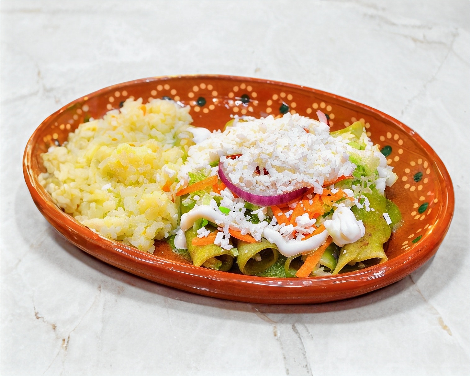 3 Enchiladas verdes, rojas o divorciadas, rellenas de pollo, acompañadas de arroz.
