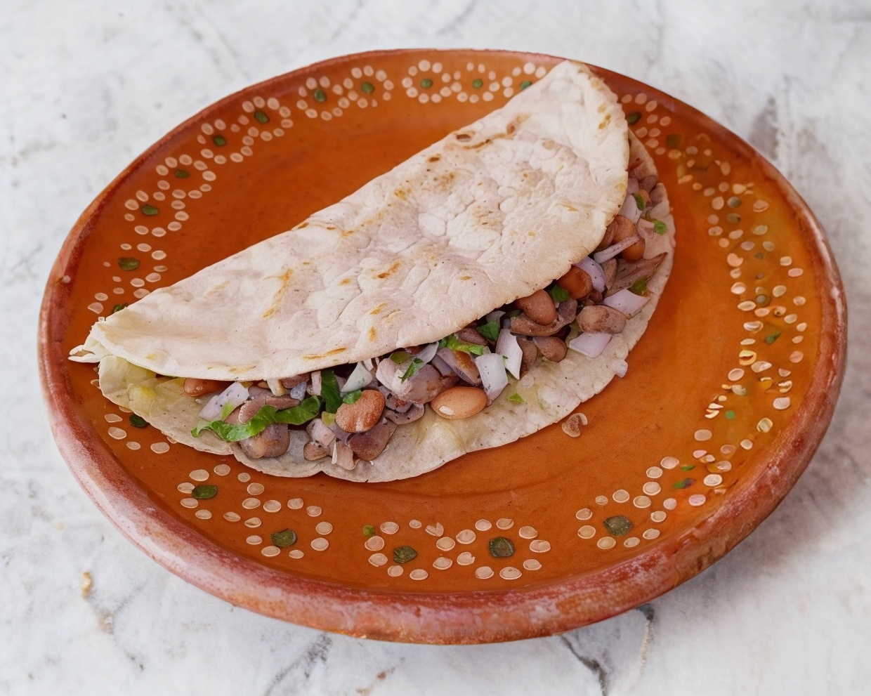 Tortilla hecha a mano, con cebolla, cilantro, frijoles y col.