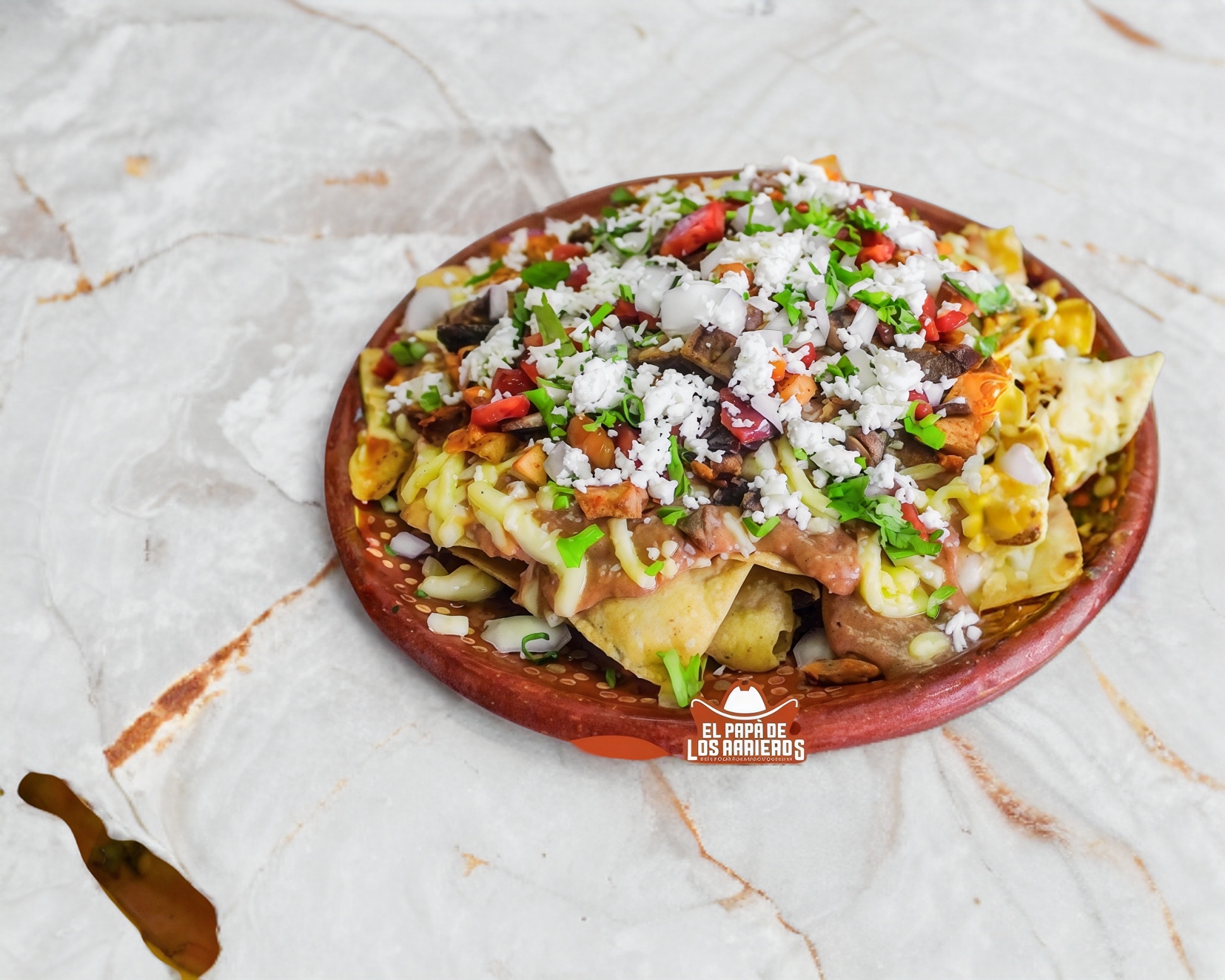 Nachos con carne de tu elección, queso gratinado, cebolla, cilantro y queso fresco.