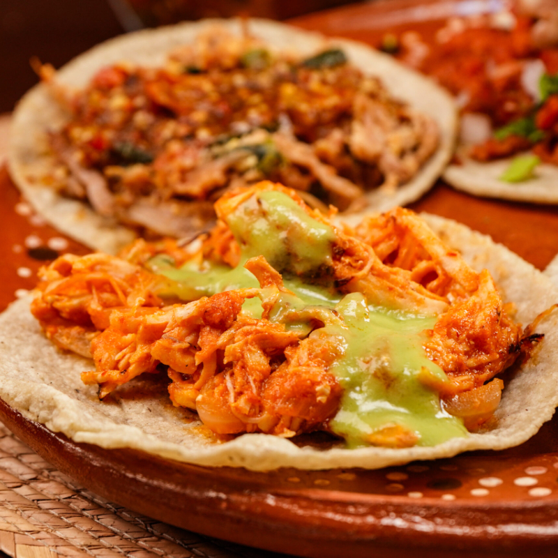 Tortilla dorada con queso gratinado, carnes y cebolla y cilantro.