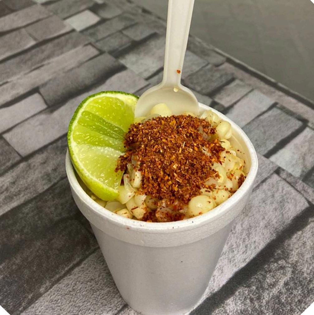 Vaso de 6 oz incluye elote de sabor, 2 aderezos, 2 quesos, 2 chiles y extras.