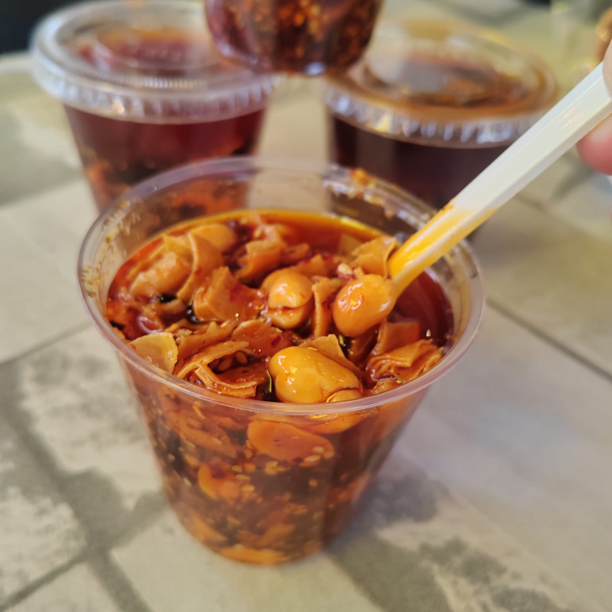 1 Elote entero partido en rodajas , mezclados con aderezos y picantes a tu gusto , puestos en un contenedor de 6x6