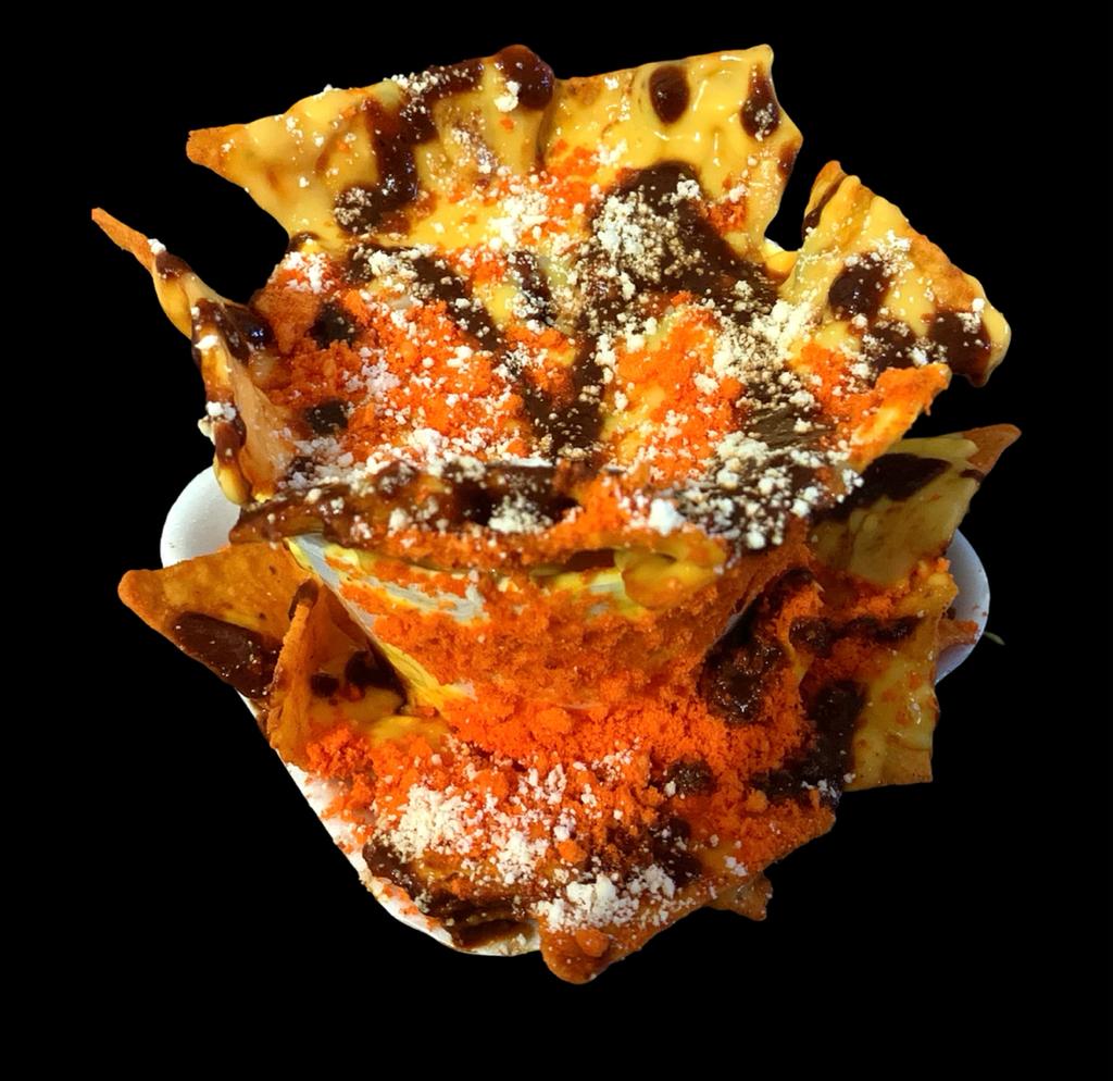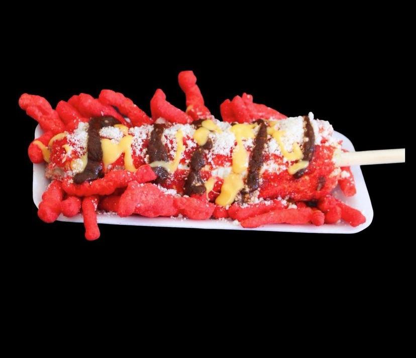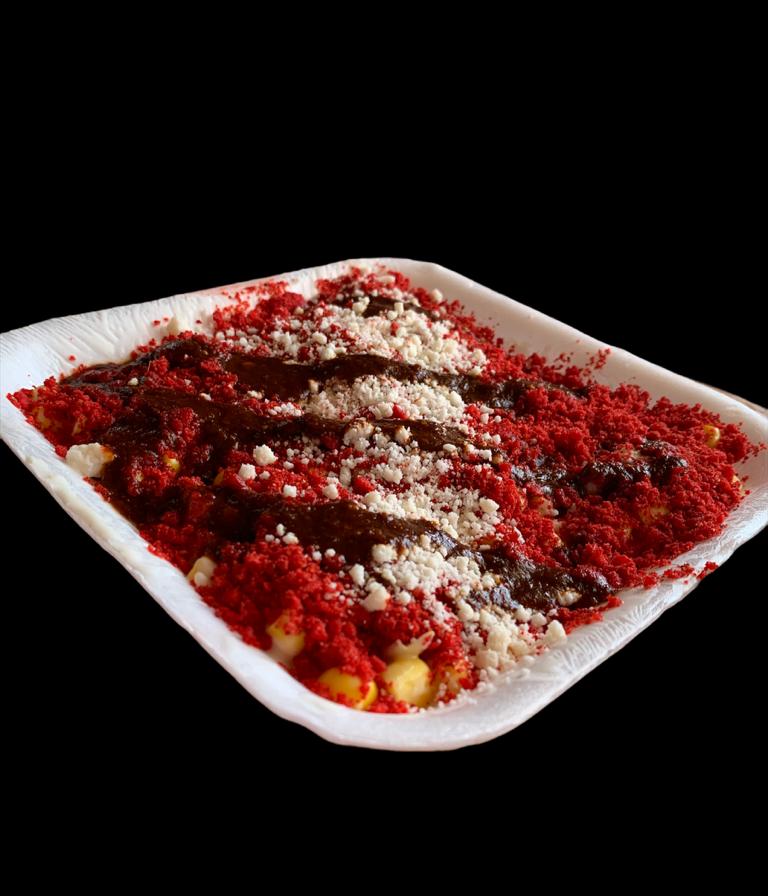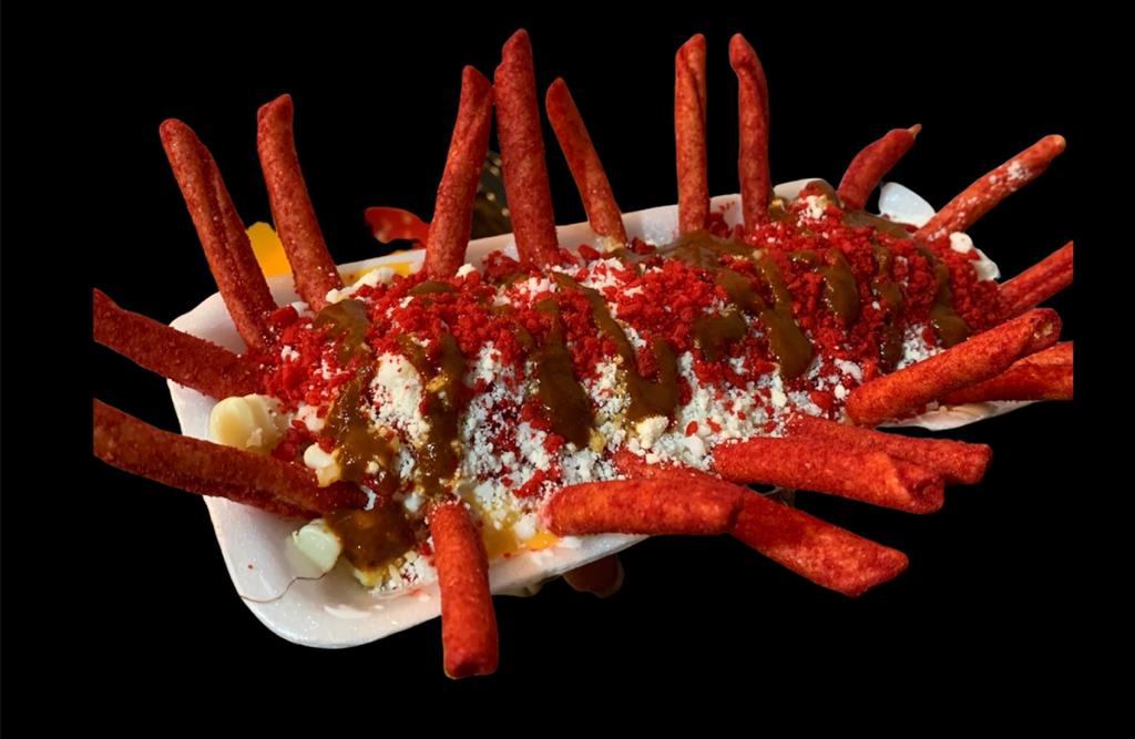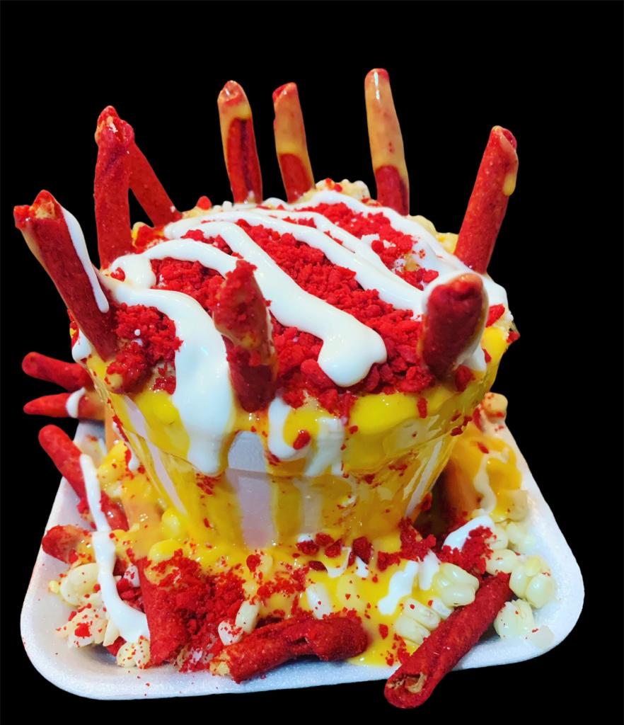 elote preparado con crema y/o mayonesa, queso blanco, amarillo, empanizado de takis fuego, y al rededor takis fuego.