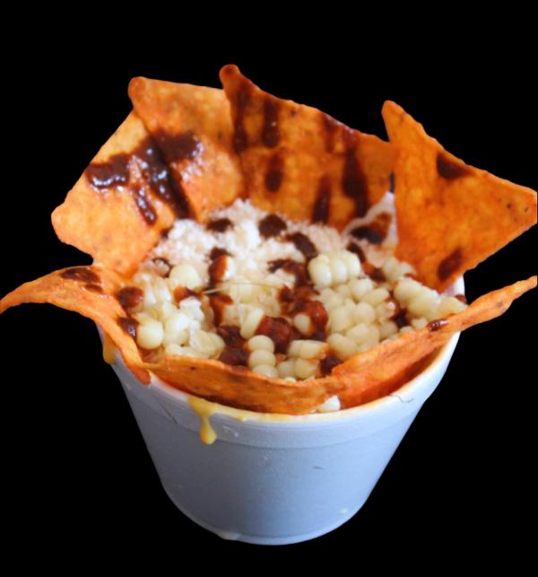 Conformado por; tostitos, elote rebanado, queso amarillo, queso blanco, topping de sabritas, crema y/o mayonesa, y jalapeño