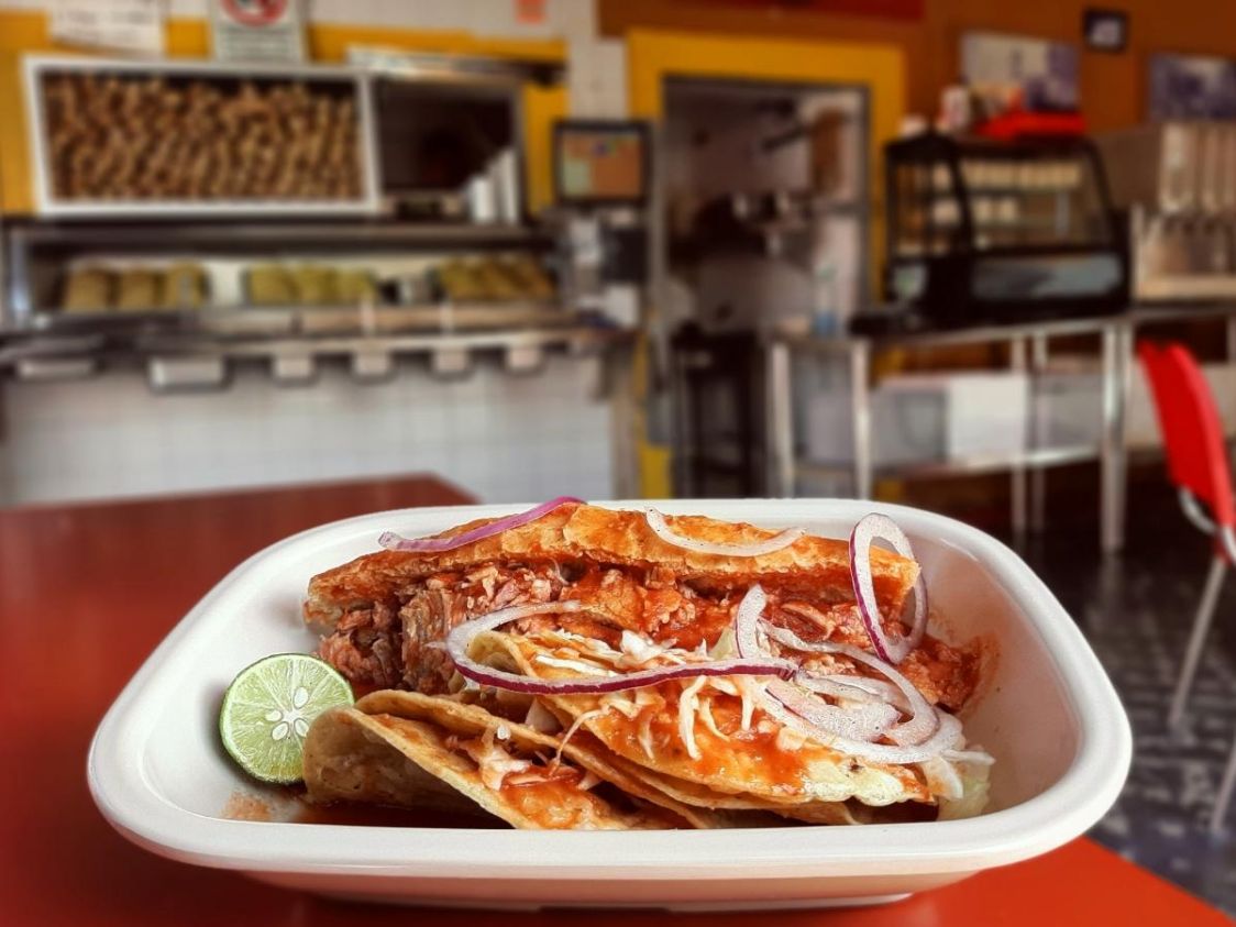 Delicioso taco dorado con carnitas, acompañado de verduras y salsas.