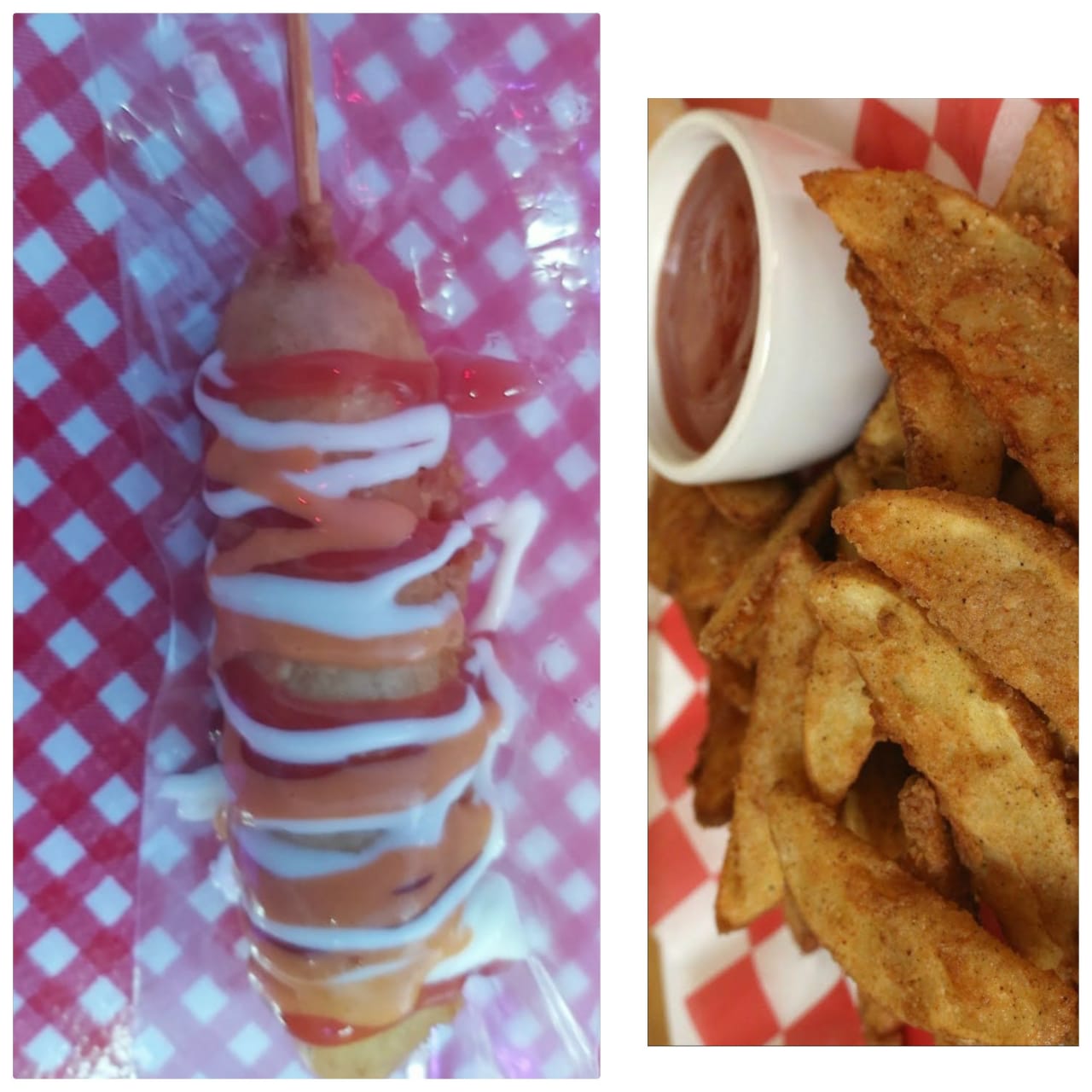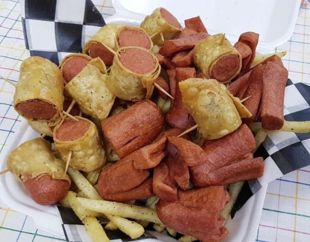 Es una salchicha envuelta en masa de la casa y frita en aceite. Acompañado de catup, crema y mostaza.