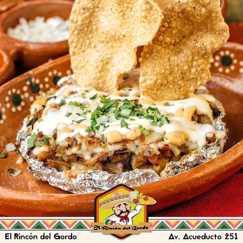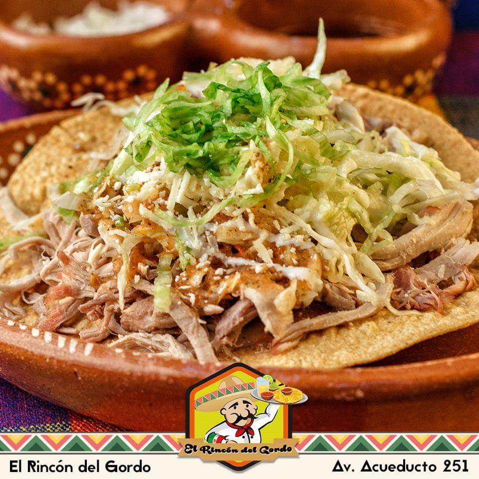 Gordita de masa rellena y gratinada, Acompañada de cebolla, queso molido, crema, cilantro y salsa verde.