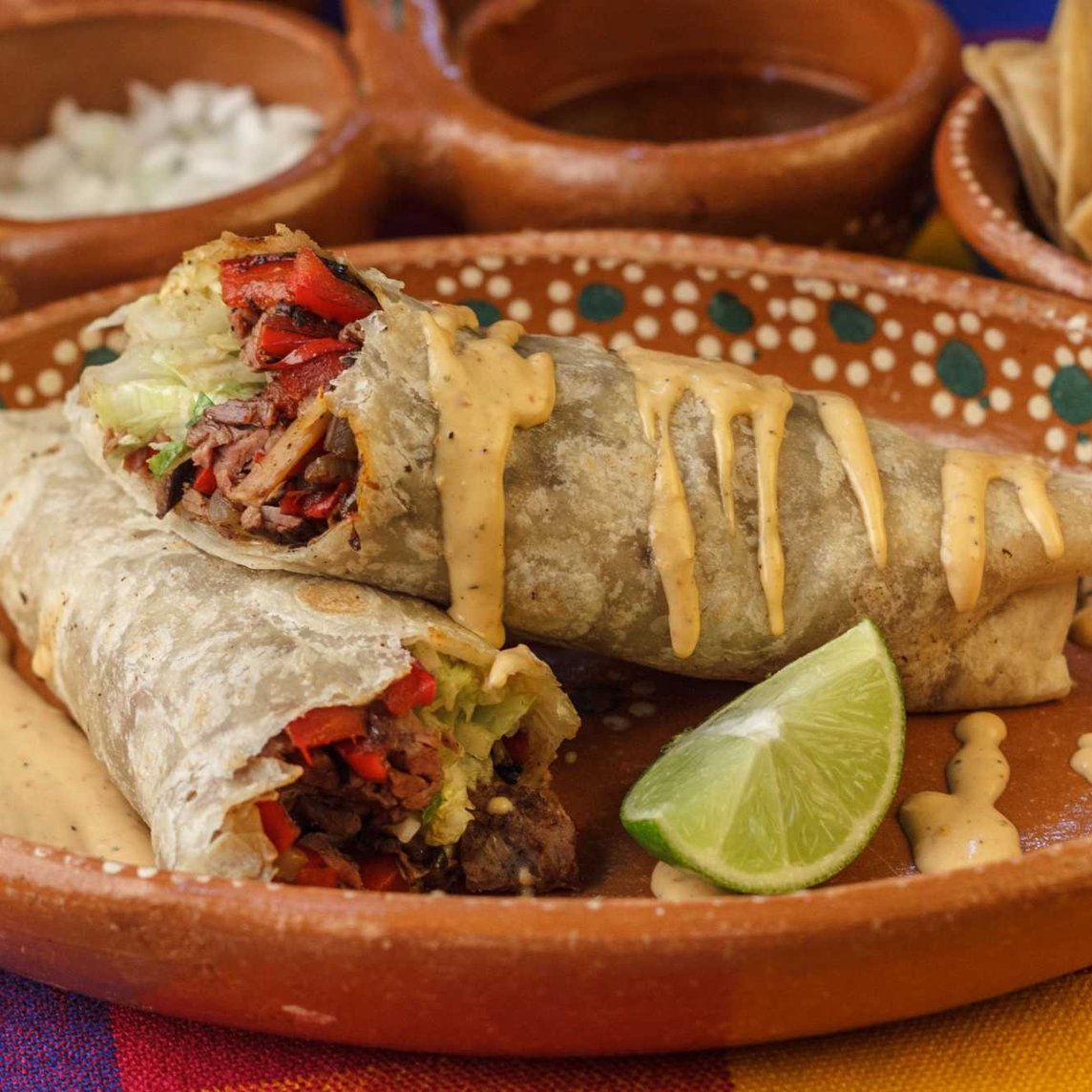Tortilla de harina gigante rellena con queso y carne a tu elección. Cebolla y cilantro.
