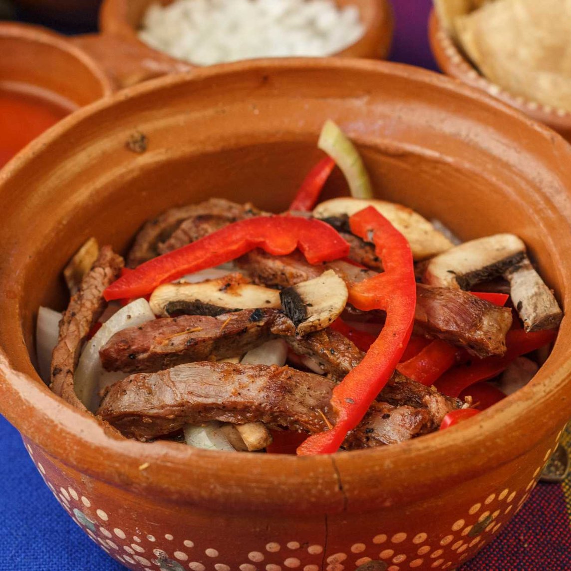 Arrachera asada, morrón, cebolla, champiñones y jitomate.