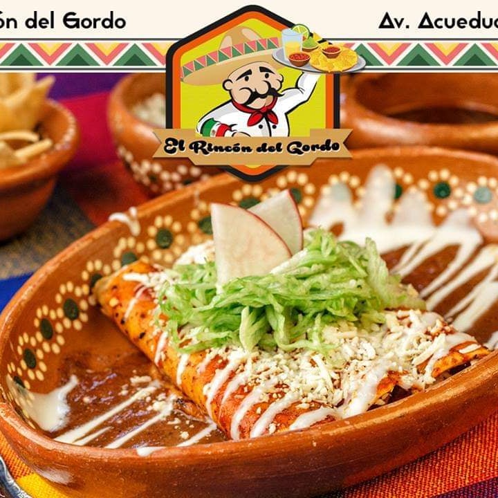 Tortilla rellena frita en aceite, bañada con salsa verde y queso gratinado. Acompañada con cebolla y cilantro.