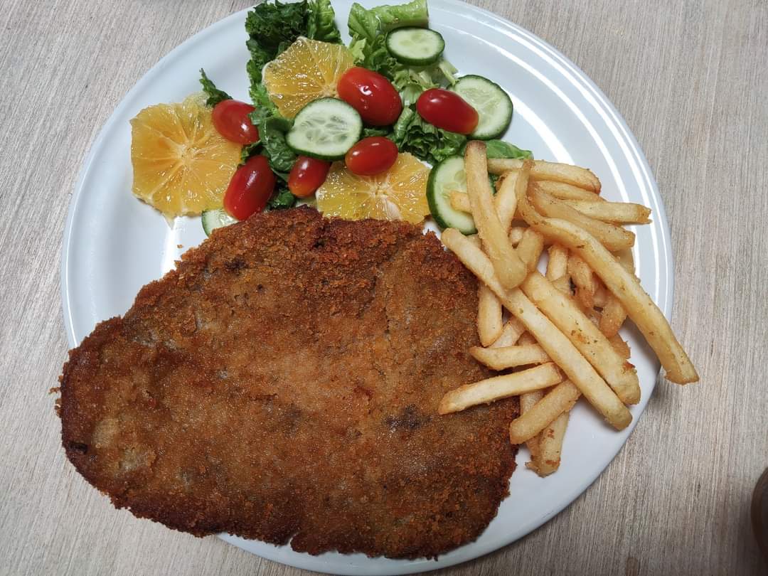 Milanesa de Seitan servida con papas y frijoles