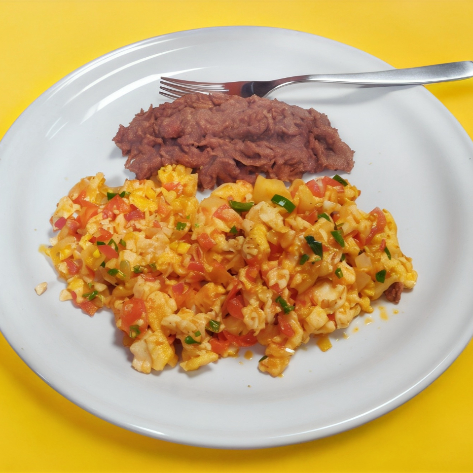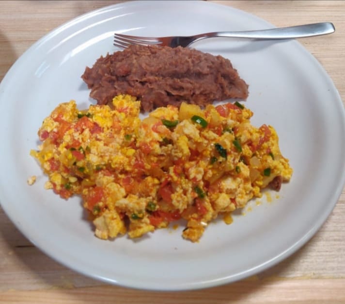 Huevo vegano de tofu servido con frijoles