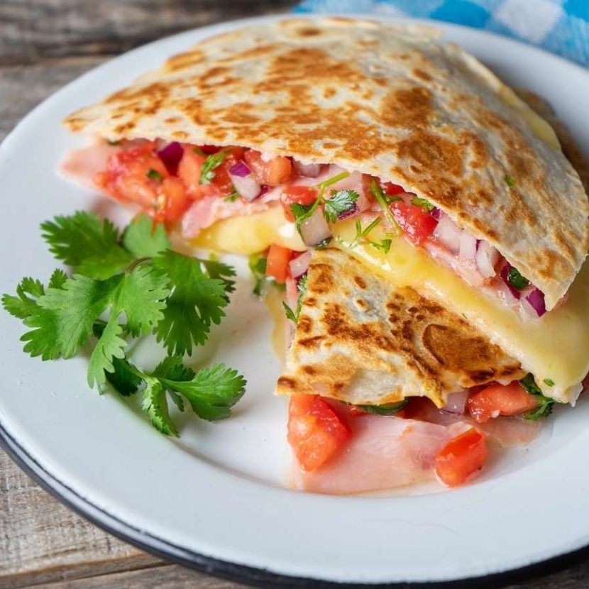 Tortilla de harina, jamón de pierna, queso, crema, jitomate, cebolla y lechuga.