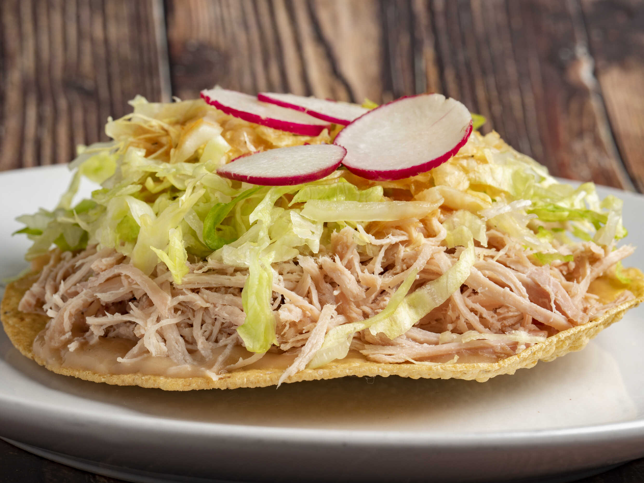 Carne de puerco, carne surtida de cabeza o con carne de pierna, cebolla, limón (por aparte), chile picante, lechuga, rábanos.