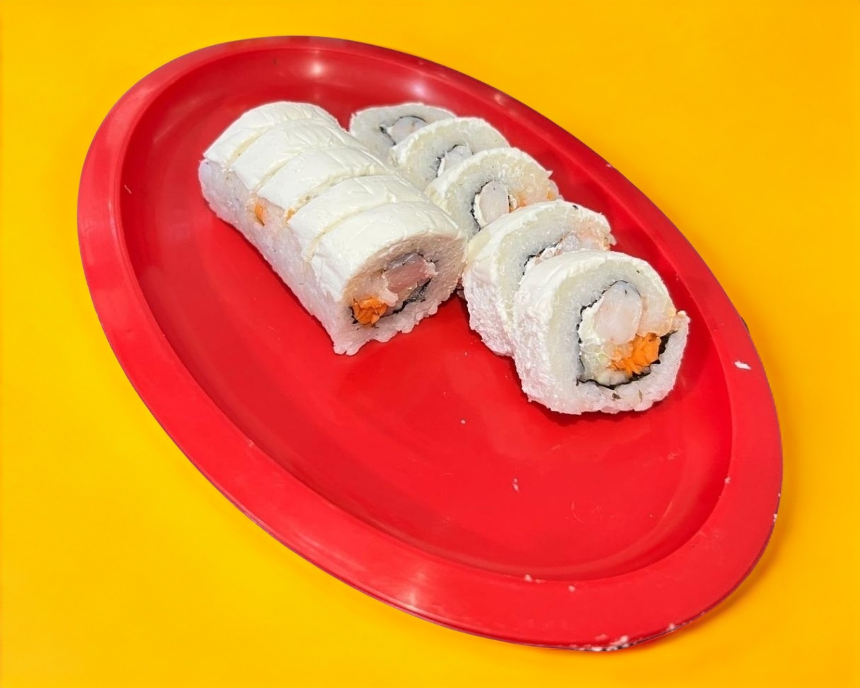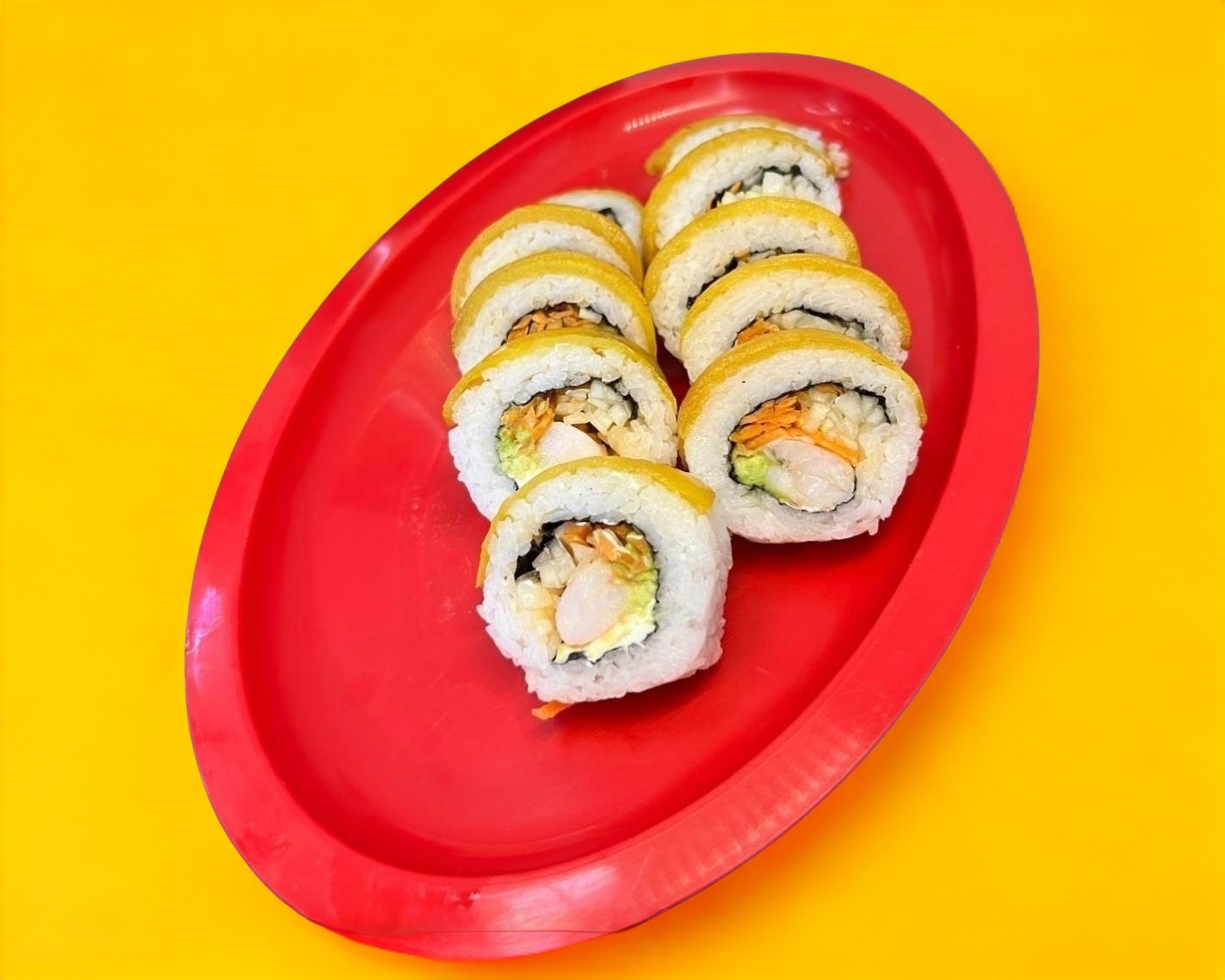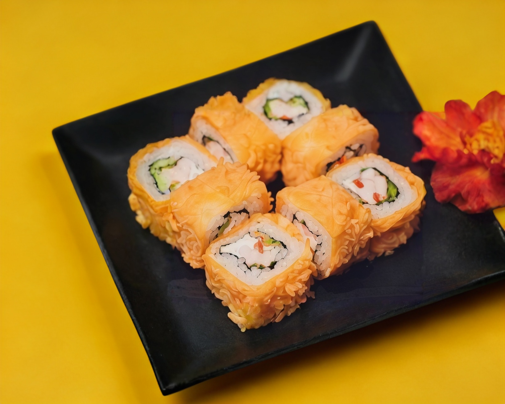Rollo de arroz cubierto de Philadelphia empanizado con relleno de alga, pepino, zanahoria y aguacate. Proteína a elegir.