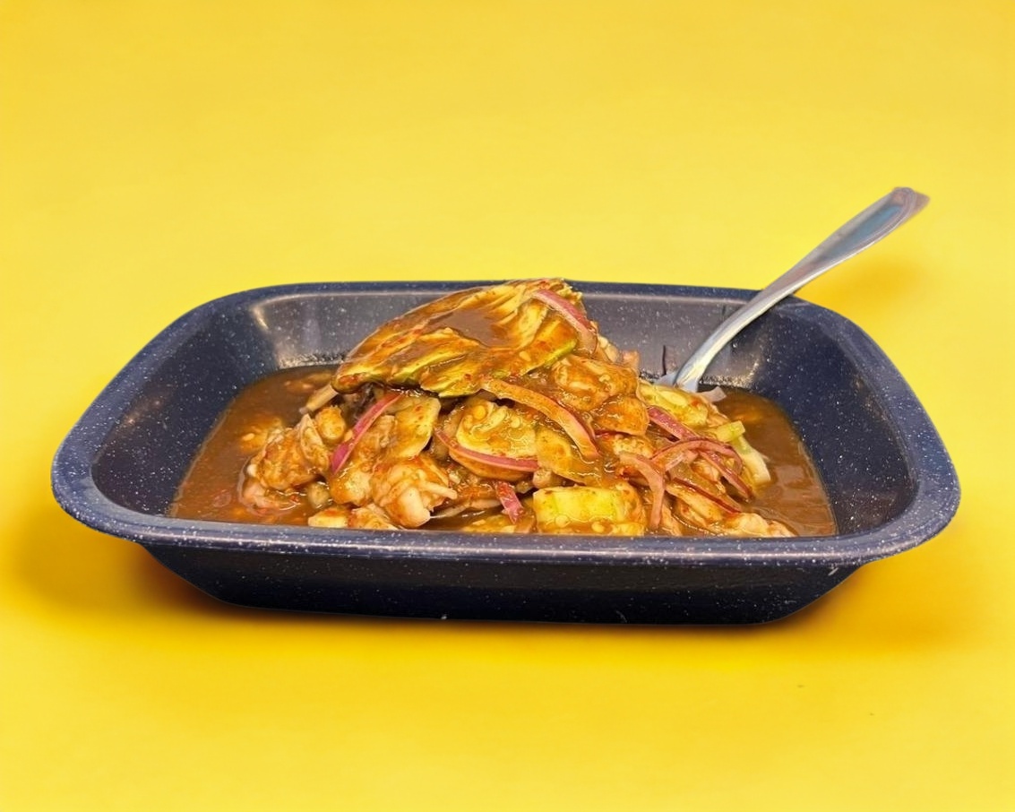 Camarones con mantequilla, ajo elote amarillo, papa cambray y salsa especial de la casa.