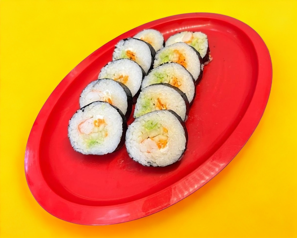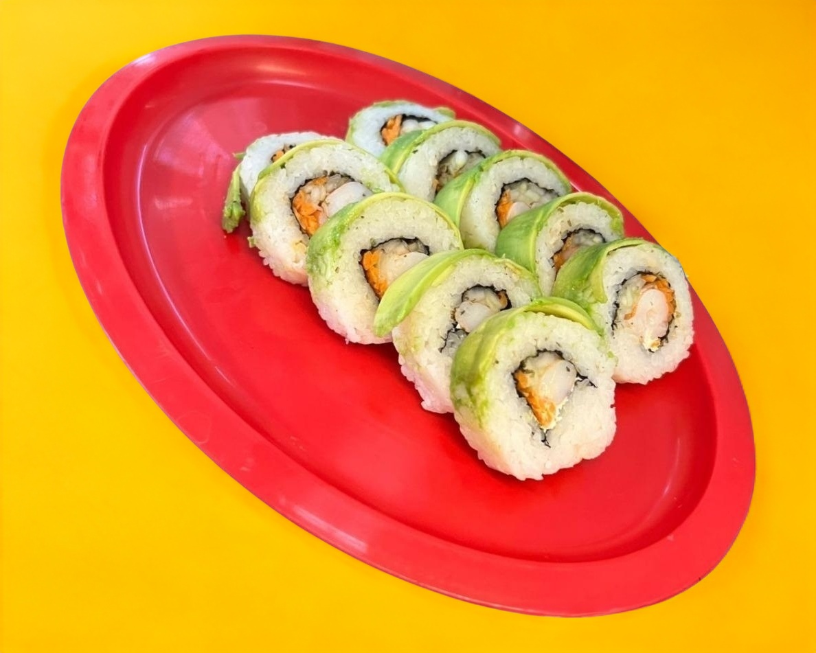 Rollo de arroz cubierto de aguacate relleno de alga, pepino, zanahoria, aguacate y Philadelphia. Proteína a elegir.