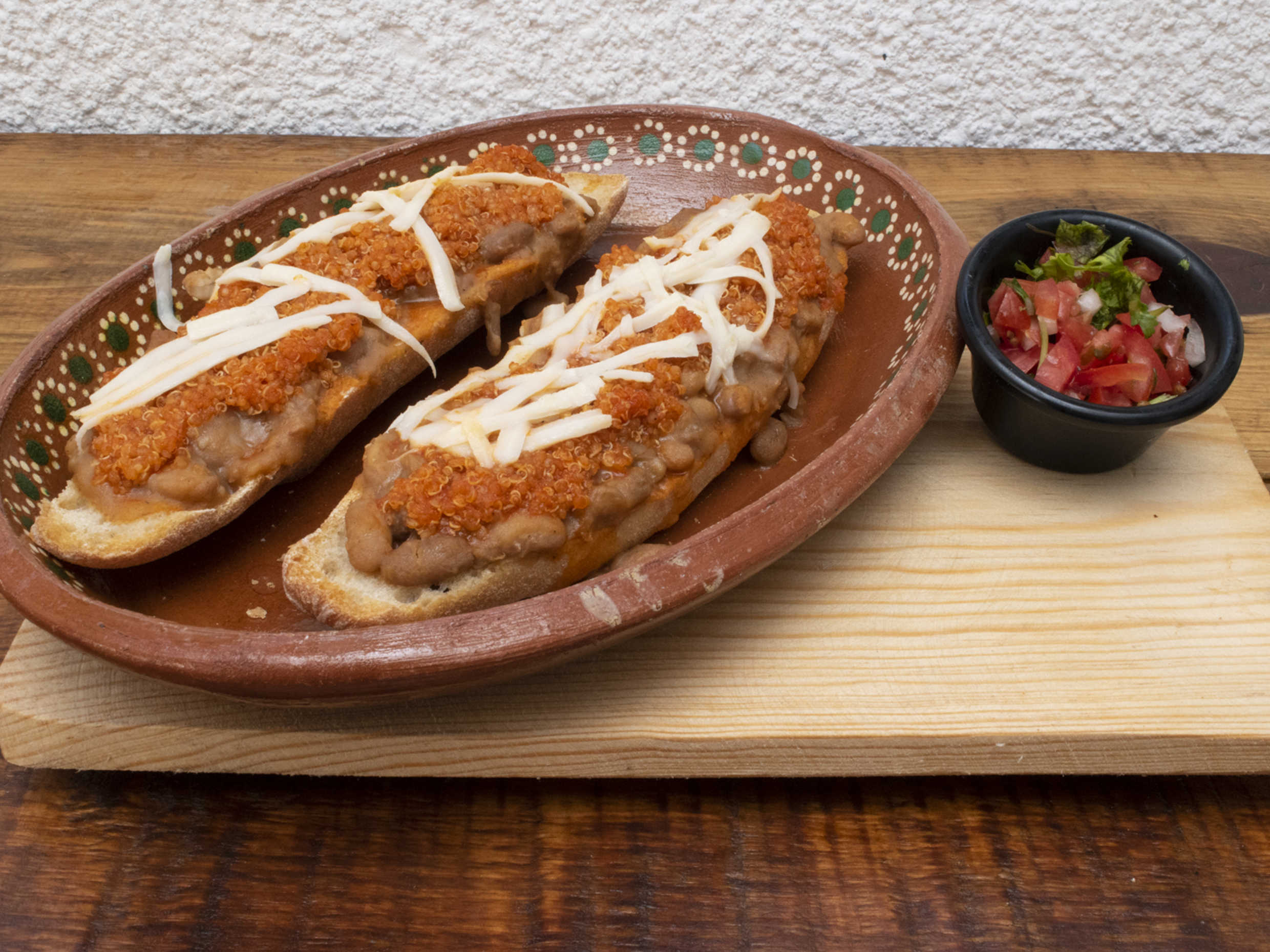 Birote fleima con frijoles, chorizo de quinoa, queso de almendras, gratinados y servidos con salsa mexicana.
