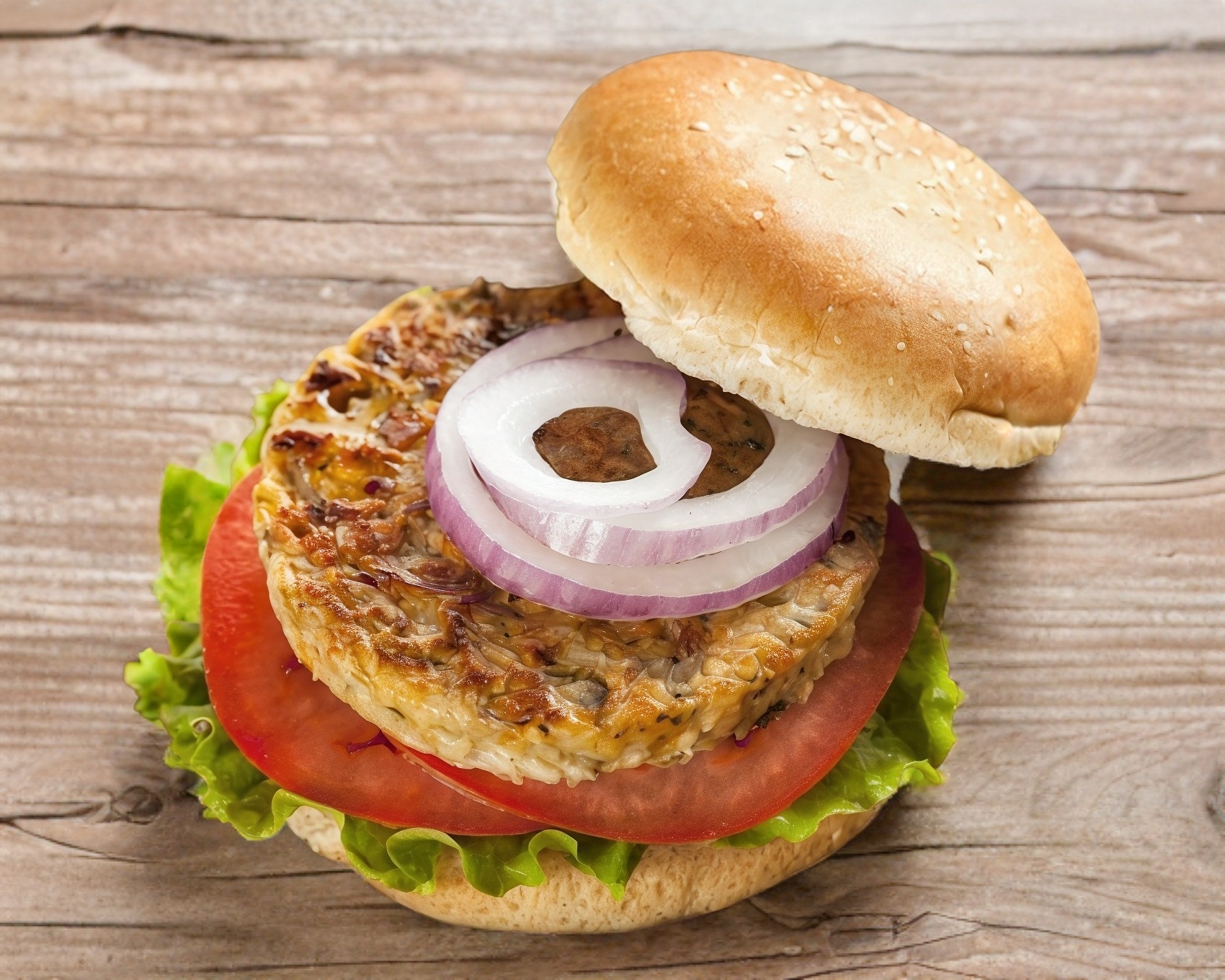 Pan de hamburguesa, relleno de portobello horneado de aceite de olivo con albahaca con una rebanada de queso de papa, servida con lechuga, jitomate y pepino, cátsup y mostaza.